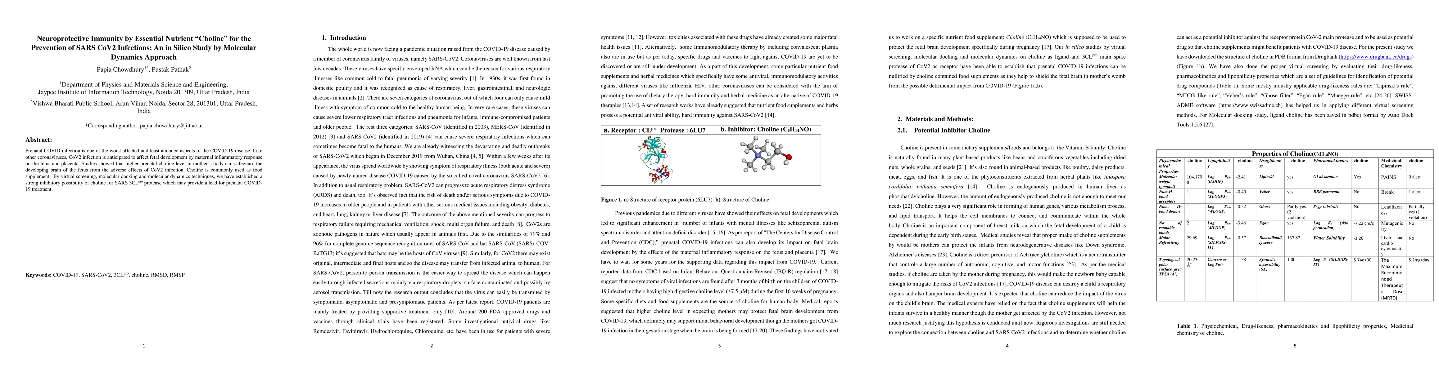 This in silico study investigates the neuroprotective potential of choline against SARS-CoV2 infections, particularly in prenatal contexts. Using molecular dynamics, the research demonstrates choline's strong inhibitory effect on the SARS 3CLpro protease, suggesting it could be a lead for prenatal COVID-19 treatment.