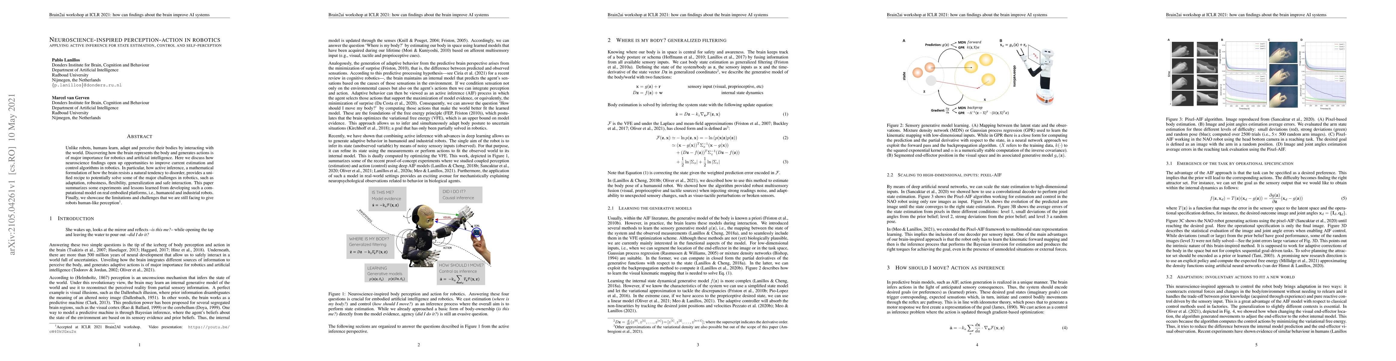 Unlike robots, humans learn, adapt and perceive their bodies by interacting with the world. Discovering how the brain represents the body and generates actions is of major importance for robotics and artificial intelligence. Here we discuss how neuroscience findings open up opportunities to improve current estimation and control algorithms in robotics. In particular, how active inference, a mathematical formulation of how the brain resists a natural tendency to disorder, provides a unified recipe to potentially solve some of the major challenges in robotics, such as adaptation, robustness, flexibility, generalization and safe interaction. This paper summarizes some experiments and lessons learned from developing such a computational model on real embodied platforms, i.e., humanoid and industrial robots. Finally, we showcase the limitations and challenges that we are still facing to give robots human-like perception