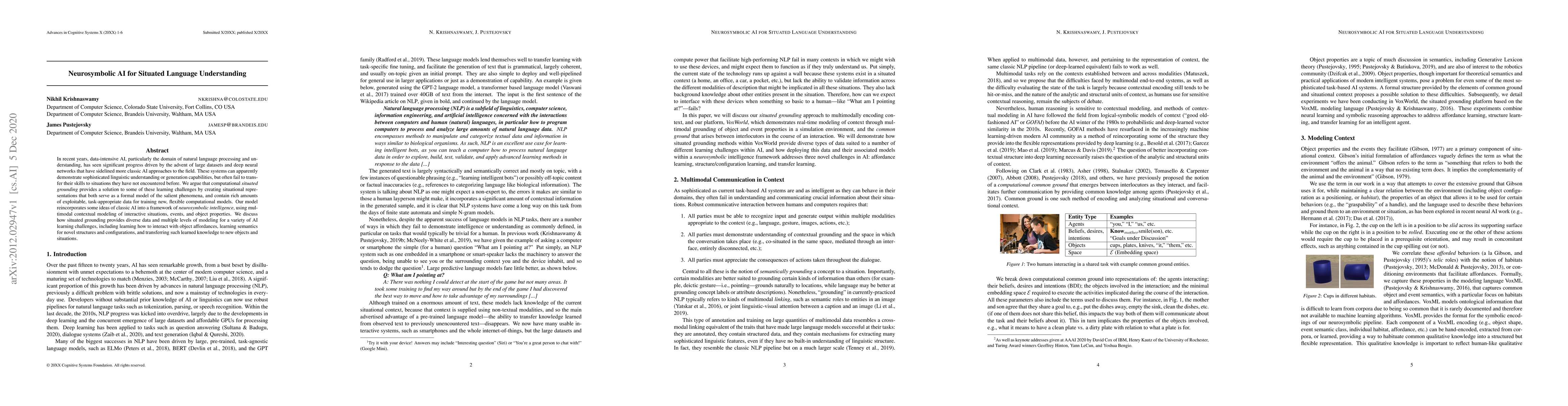In recent years, data-intensive AI, particularly the domain of natural language processing and understanding, has seen significant progress driven by the advent of large datasets and deep neural networks that have sidelined more classic AI approaches to the field. These systems can apparently demonstrate sophisticated linguistic understanding or generation capabilities, but often fail to transfer their skills to situations they have not encountered before. We argue that computational situated grounding provides a solution to some of these learning challenges by creating situational representations that both serve as a formal model of the salient phenomena, and contain rich amounts of exploitable, task-appropriate data for training new, flexible computational models. Our model reincorporates some ideas of classic AI into a framework of neurosymbolic intelligence, using multimodal contextual modeling of interactive situations, events, and object properties. We discuss how situated grounding provides diverse data and multiple levels of modeling for a variety of AI learning challenges, including learning how to interact with object affordances, learning semantics for novel structures and configurations, and transferring such learned knowledge to new objects and situations.