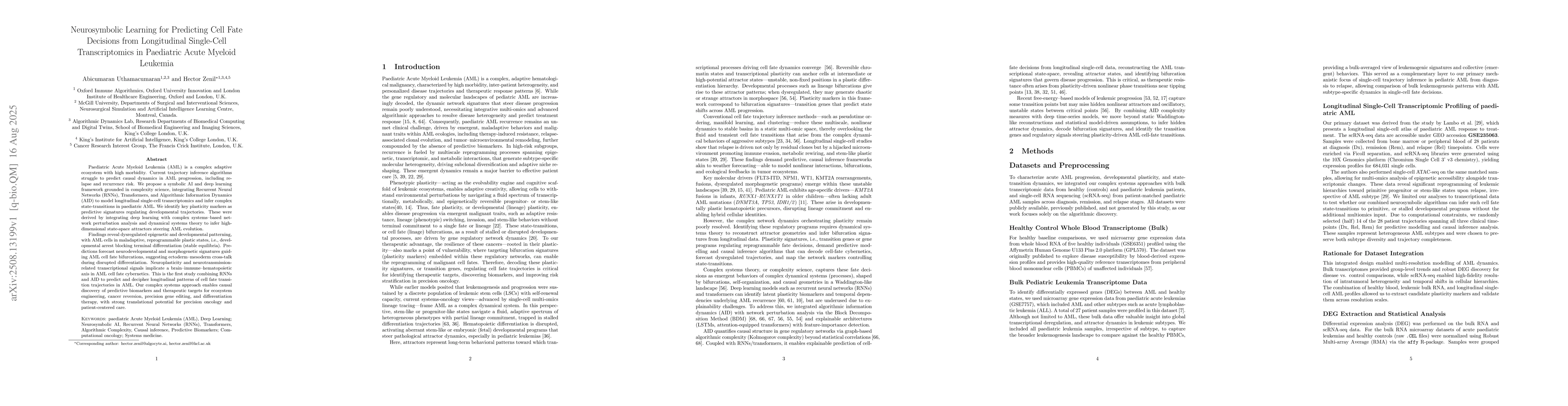 Paediatric Acute Myeloid Leukemia is a complex adaptive ecosystem with high morbidity. Current trajectory inference algorithms struggle to predict causal dynamics in AML progression, including relapse and recurrence risk. We propose a symbolic AI and deep learning framework grounded in complexity science, integrating Recurrent Neural Networks, Transformers, and Algorithmic Information Dynamics to model longitudinal single cell transcriptomics and infer complex state transitions in paediatric AML. We identify key plasticity markers as predictive signatures regulating developmental trajectories. These were derived by integrating deep learning with complex systems based network perturbation analysis and dynamical systems theory to infer high dimensional state space attractors steering AML evolution. Findings reveal dysregulated epigenetic and developmental patterning, with AML cells in maladaptive, reprogrammable plastic states, i.e., developmental arrest blocking terminal differentiation. Predictions forecast neurodevelopmental and morphogenetic signatures guiding AML cell fate bifurcations, suggesting ectoderm mesoderm crosstalk during disrupted differentiation. Neuroplasticity and neurotransmission related transcriptional signals implicate a brain immune hematopoietic axis in AML cell fate cybernetics. This is the first study combining RNNs and AID to predict and decipher longitudinal patterns of cell fate transition trajectories in AML. Our complex systems approach enables causal discovery of predictive biomarkers and therapeutic targets for ecosystem engineering, cancer reversion, precision gene editing, and differentiation therapy, with strong translational potential for precision oncology and patient centered care.