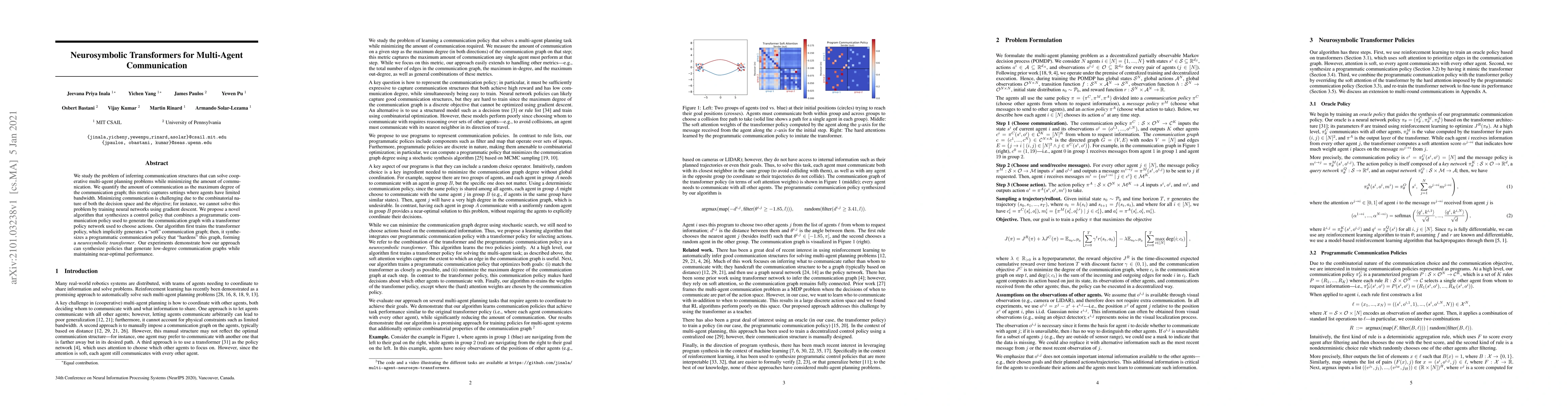 We study the problem of inferring communication structures that can solve cooperative multi-agent planning problems while minimizing the amount of communication. We quantify the amount of communication as the maximum degree of the communication graph; this metric captures settings where agents have limited bandwidth. Minimizing communication is challenging due to the combinatorial nature of both the decision space and the objective; for instance, we cannot solve this problem by training neural networks using gradient descent. We propose a novel algorithm that synthesizes a control policy that combines a programmatic communication policy used to generate the communication graph with a transformer policy network used to choose actions. Our algorithm first trains the transformer policy, which implicitly generates a "soft" communication graph; then, it synthesizes a programmatic communication policy that "hardens" this graph, forming a neurosymbolic transformer. Our experiments demonstrate how our approach can synthesize policies that generate low-degree communication graphs while maintaining near-optimal performance.