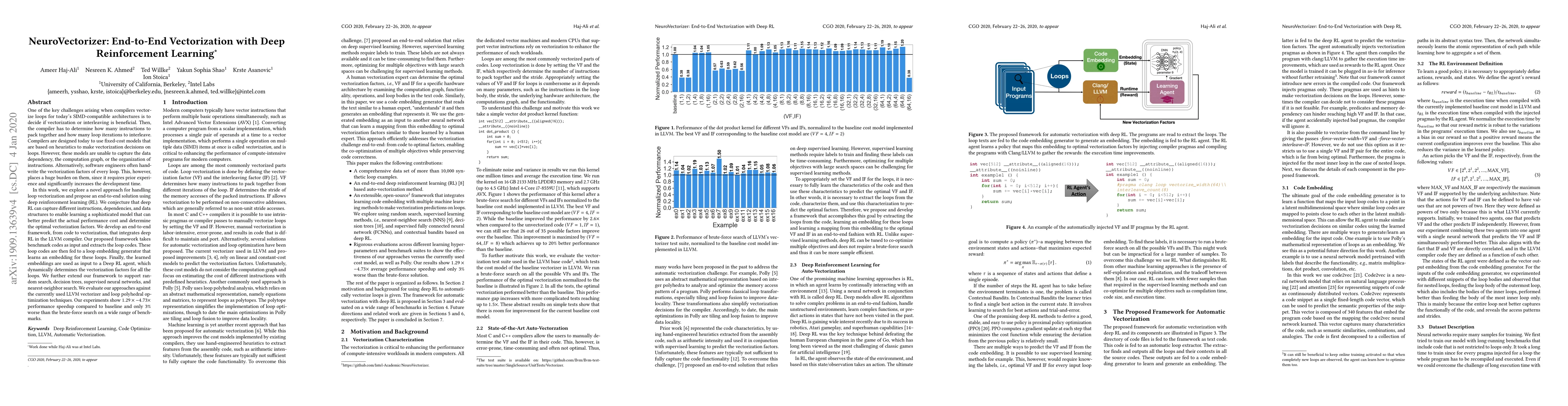 The paper proposes NeuroVectorizer, an end-to-end framework using deep reinforcement learning to optimize loop vectorization for SIMD-compatible architectures, aiming to outperform traditional heuristic-based methods and manual vectorization by learning optimal vectorization factors. Experimental results show significant performance improvements over baselines.