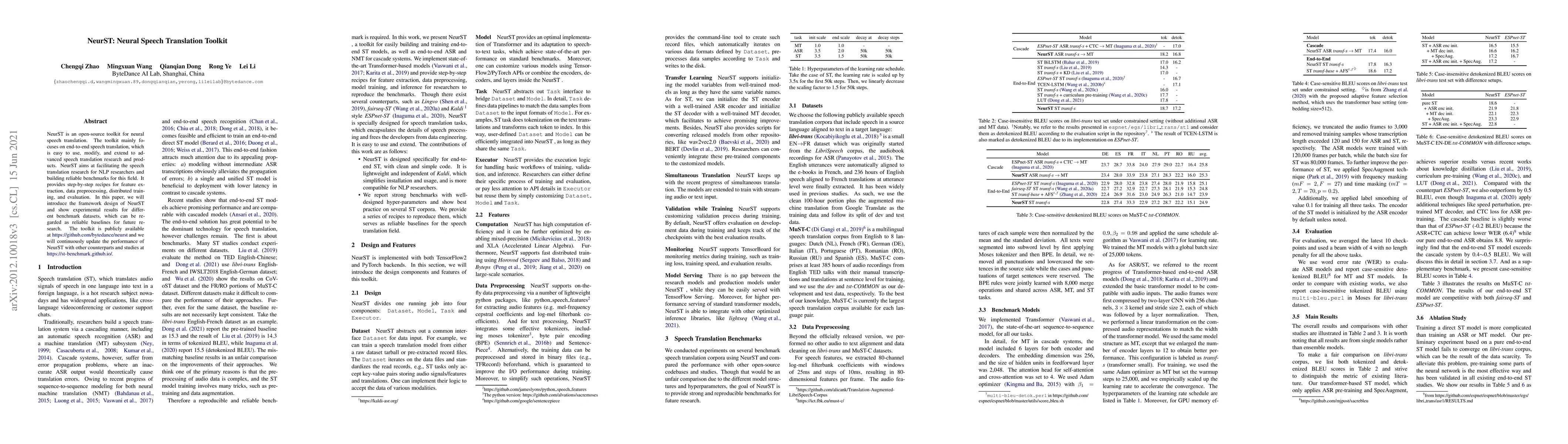 NeurST is an open-source toolkit designed for neural speech translation, focusing on end-to-end translation processes. It offers comprehensive tools for feature extraction, data preprocessing, and distributed training, serving as a reliable benchmark for future research.