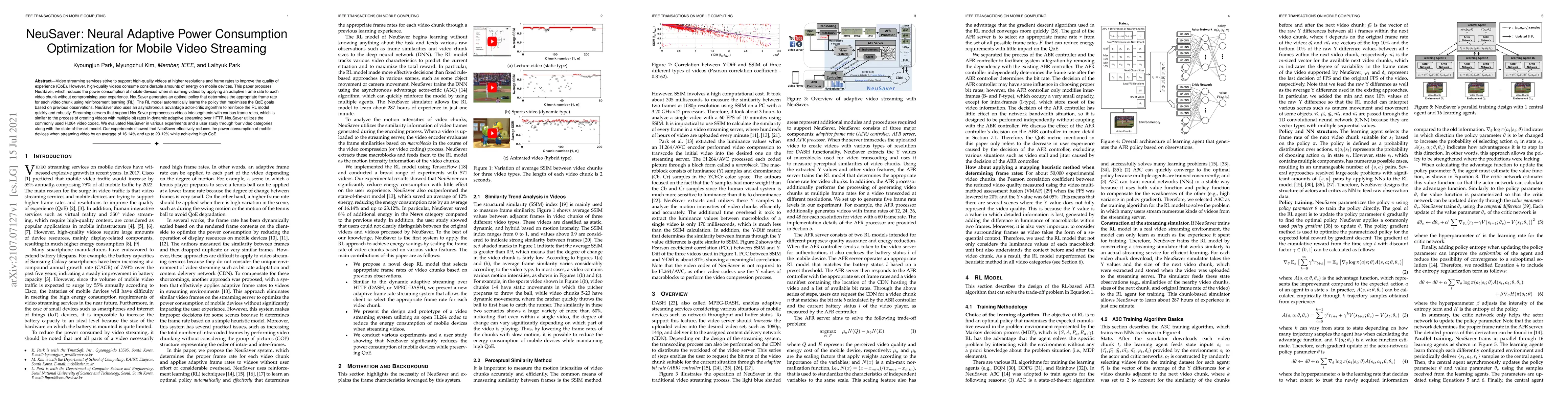 NeuSaver optimizes power consumption for mobile video streaming by adaptively adjusting frame rates using reinforcement learning, achieving an average reduction of 16.14% in power usage while maintaining high quality of experience. The RL model employs an asynchronous advantage actor-critic algorithm for efficient learning and robust policy generation.