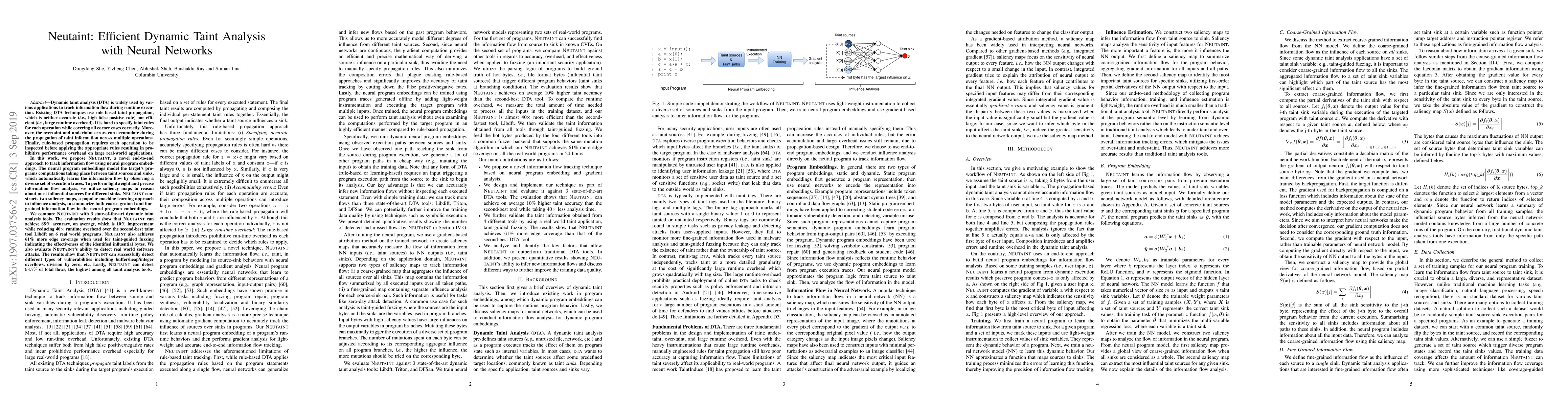 NEUTAINT proposes a neural network-based approach to dynamic taint analysis, using neural program embeddings to model information flow, achieving 10% higher accuracy and 40 times lower runtime overhead compared to existing rule-based methods, while also improving edge coverage for taint-guided fuzzing.