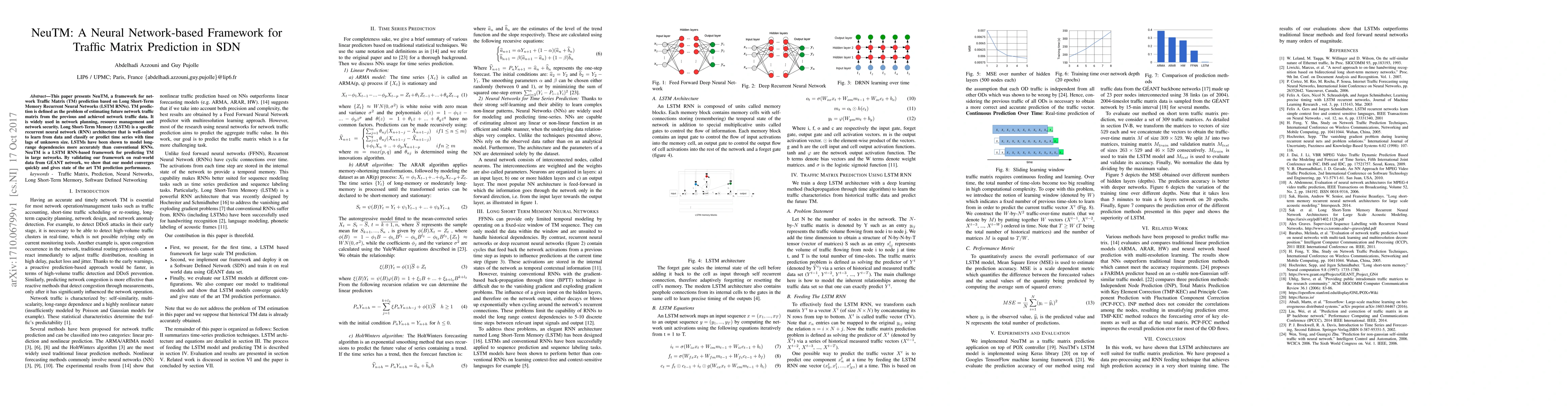 NeuTM is a LSTM RNN-based framework for predicting Traffic Matrices in SDN networks, demonstrating state-of-the-art performance and quick convergence on real-world data from GEEANT network.