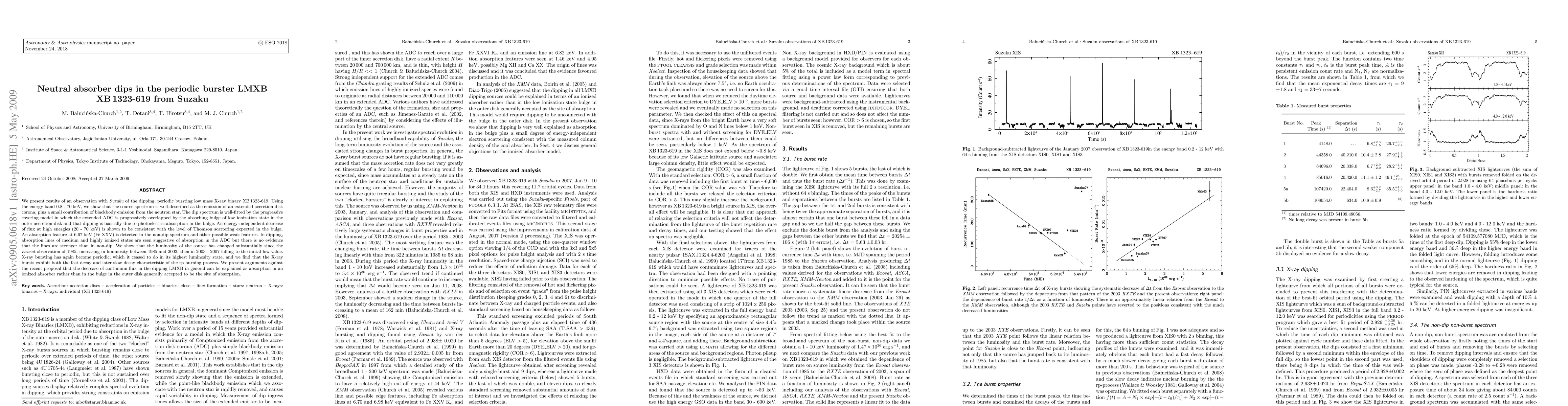 We present results of an observation with Suzaku of the dipping, periodic bursting low mass X-ray binary XB 1323-619. Using the energy band 0.8 - 70 keV, we show that the source spectrum is well-described as the emission of an extended accretion disk corona, plus a small contribution of blackbody emission from the neutron star. The dip spectrum is well-fitted by the progressive covering model in which the extended ADC is progressively overlapped by the absorbing bulge of low ionization state in the outer accretion disk and that dipping is basically due to photoelectric absorption in the bulge. An energy-independent decrease of flux at high energies (20 - 70 keV) is shown to be consistent with the level of Thomson scattering expected in the bulge. An absorption feature at 6.67 keV (Fe XXV) is detected in the non-dip spectrum and other possible weak features. In dipping, absorption lines of medium and highly ionized states are seen suggestive of absorption in the ADC but there is no evidence that the lines are stronger than in non-dip. We show that the luminosity of the source has changed substantially since the Exosat observation of 1985, increasing in luminosity between 1985 and 2003, then in 2003 - 2007 falling to the initial low value. X-ray bursting has again become periodic, which it ceased to do in its highest luminosity state, and we find that the X-ray bursts exhibit both the fast decay and later slow decay characteristic of the rp burning process. We present arguments against the recent proposal that the decrease of continuum flux in the dipping LMXB in general can be explained as absorption in an ionized absorber rather than in the bulge in the outer disk generally accepted to be the site of absorption.