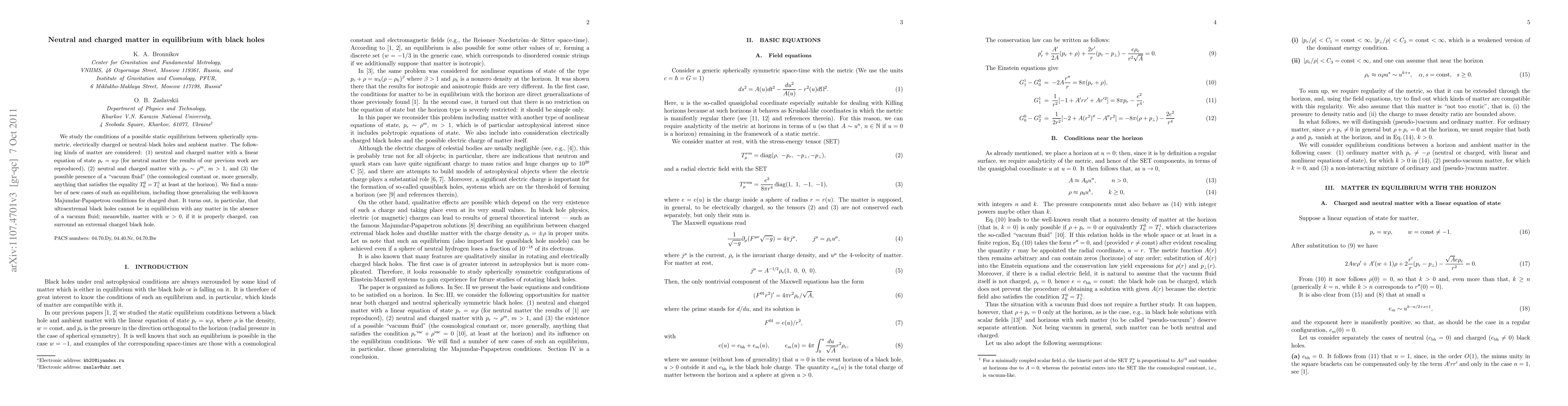 We study the conditions of a possible static equilibrium between spherically symmetric, electrically charged or neutral black holes and ambient matter. The following kinds of matter are considered: (1) neutral and charged matter with a linear equation of state p_r = w\rho (for neutral matter the results of our previous work are reproduced), (2) neutral and charged matter with p_r \sim \rho^m, m > 1, and (3) the possible presence of a "vacuum fluid" (the cosmological constant or, more generally, anything that satisfies the equality T^0_0 = T^1_1 at least at the horizon). We find a number of new cases of such an equilibrium, including those generalizing the well-known Majumdar-Papapetrou conditions for charged dust. It turns out, in particular, that ultraextremal black holes cannot be in equilibrium with any matter in the absence of a vacuum fluid; meanwhile, matter with w > 0, if it is properly charged, can surround an extremal charged black hole.