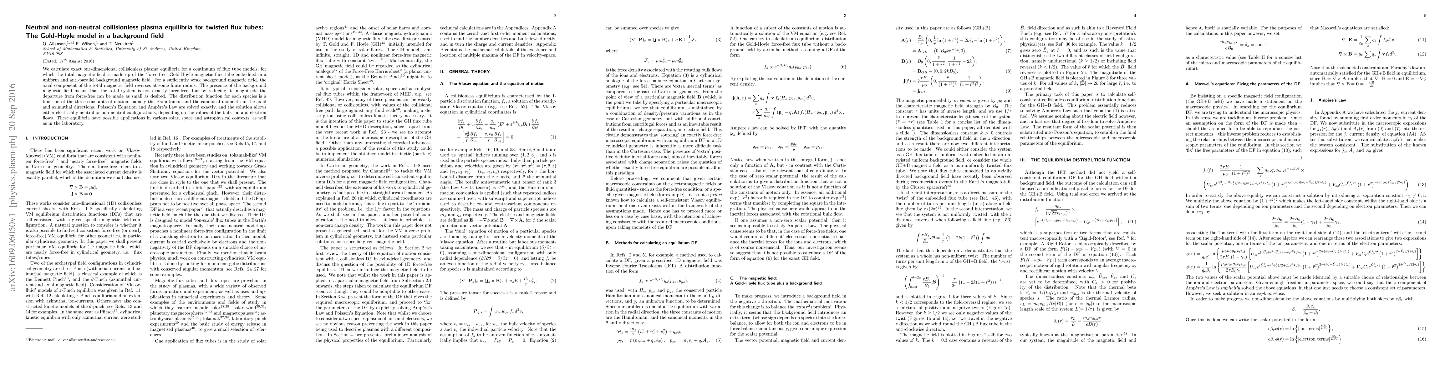 We calculate exact one-dimensional collisionless plasma equilibria for a continuum of flux tube models, for which the total magnetic field is made up of the `force-free' Gold-Hoyle magnetic flux tube embedded in a uniform and anti-parallel background magnetic field. For a sufficiently weak background magnetic field, the axial component of the total magnetic field reverses at some finite radius. The presence of the background magnetic field means that the total system is not exactly force-free, but by reducing its magnitude the departure from force-free can be made as small as desired. The distribution function for each species is a function of the three constants of motion; namely the Hamiltonian and the canonical momenta in the axial and azimuthal directions. Poisson's Equation and Amp\`{e}re's Law are solved exactly, and the solution allows either electrically neutral or non-neutral configurations, depending on the values of the bulk ion and electron flows. These equilibria have possible applications in various solar, space and astrophysical contexts, as well as in the laboratory.