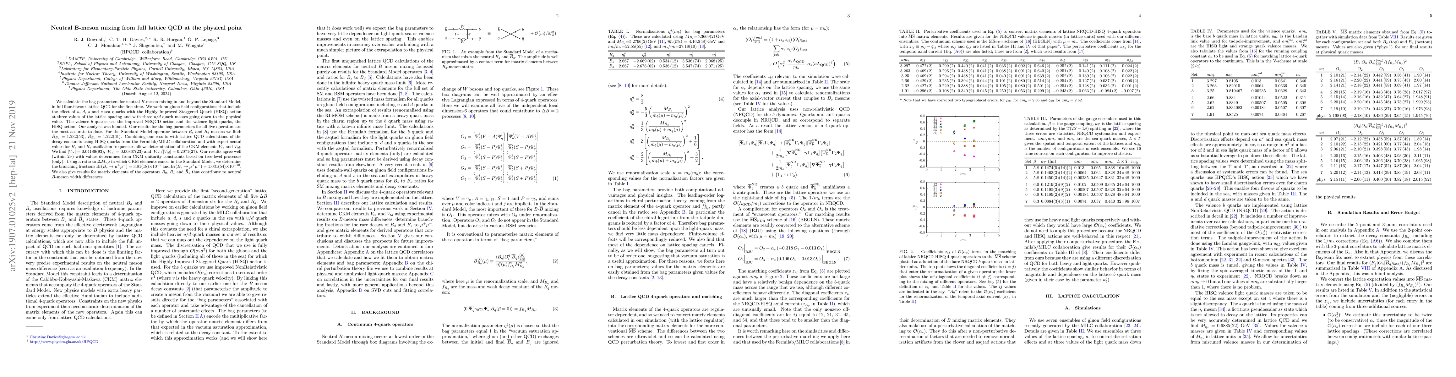 This research calculates the bag parameters for neutral B-meson mixing using full lattice QCD at the physical point, providing the most accurate results to date. The study determines CKM elements and branching fractions for rare B-meson decays, showing good agreement with experimental values.