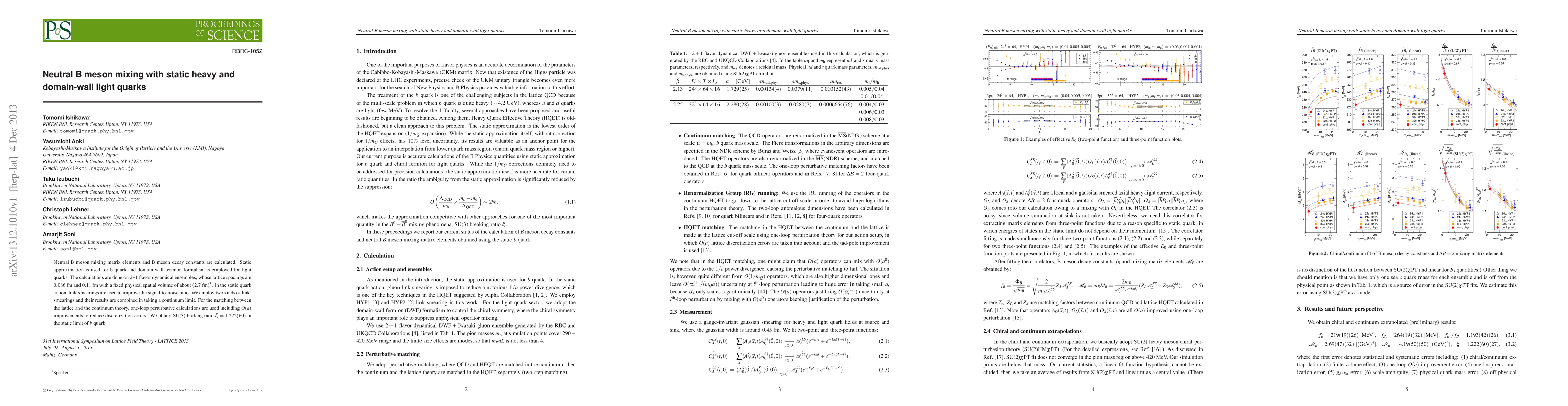 This paper calculates neutral B meson mixing matrix elements and decay constants using static heavy quarks and domain-wall fermions for light quarks on 2+1 flavor dynamical ensembles. The study employs link-smearing techniques and one-loop perturbative calculations to achieve the continuum limit, resulting in an SU(3) breaking ratio of \xi=1.222(60).