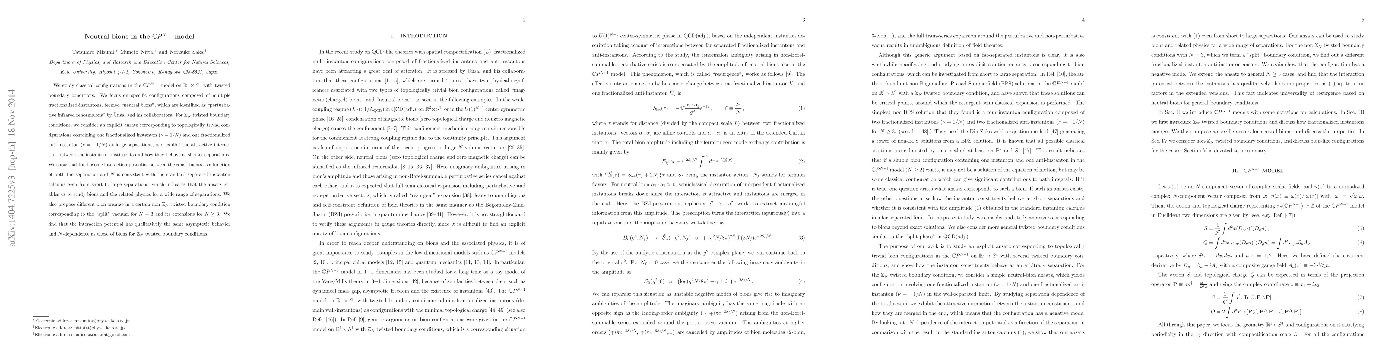 This paper investigates classical configurations in the ${\mathbb C}P^{N-1}$ model, focusing on "neutral bions" composed of fractionalized instantons and anti-instantons. It demonstrates that the proposed ansatz accurately describes the interaction potential between these constituents, consistent with standard instanton calculus across various separations, and extends findings to non-${\mathbb Z}_{N}$ twisted boundary conditions.