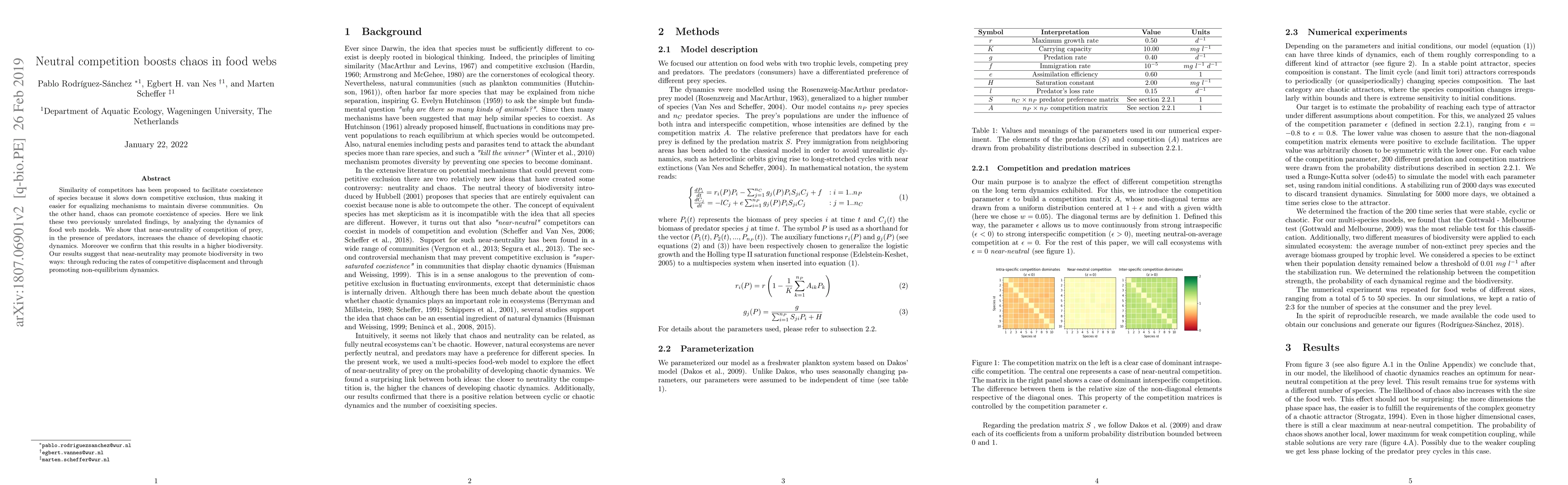 Similarity of competitors has been proposed to facilitate coexistence of species because it slows down competitive exclusion, thus making it easier for equalizing mechanisms to maintain diverse communities. On the other hand, chaos can promote coexistence of species. Here we link these two previously unrelated findings, by analyzing the dynamics of food web models. We show that near-neutrality of competition of prey, in the presence of predators, increases the chance of developing chaotic dynamics. Moreover we confirm that this results in a higher biodiversity. Our results suggest that near-neutrality may promote biodiversity in two ways: through reducing the rates of competitive displacement and through promoting non-equilibrium dynamics.