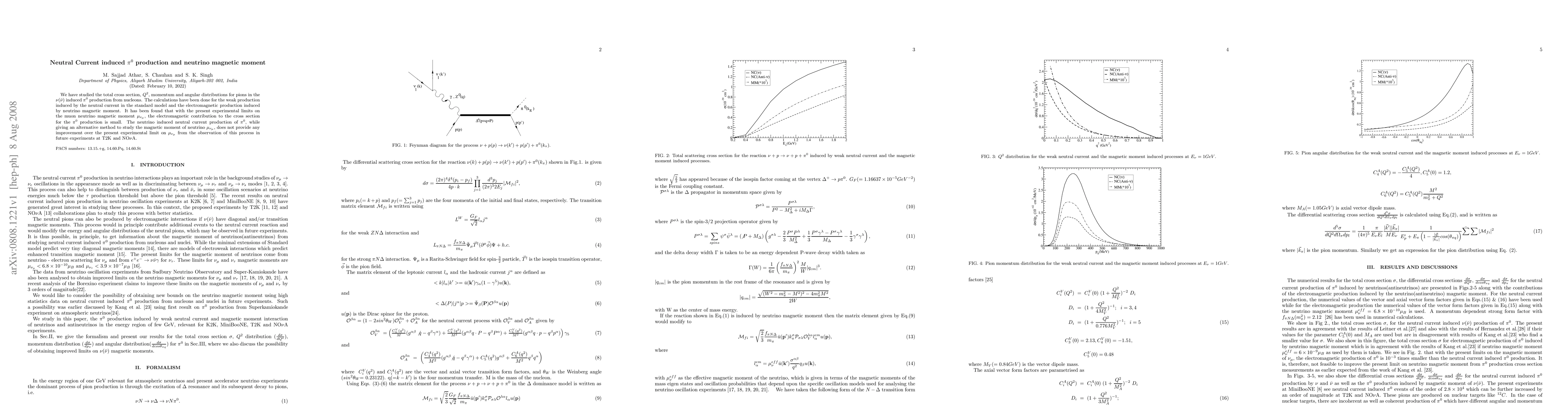 This paper investigates the total cross section and distributions for $\pi^0$ production via neutral current and neutrino magnetic moment interactions. The study finds that the electromagnetic contribution to $\pi^0$ production is minimal, and neutral current processes do not improve current limits on the neutrino magnetic moment $\mu_{\nu_\mu}$.