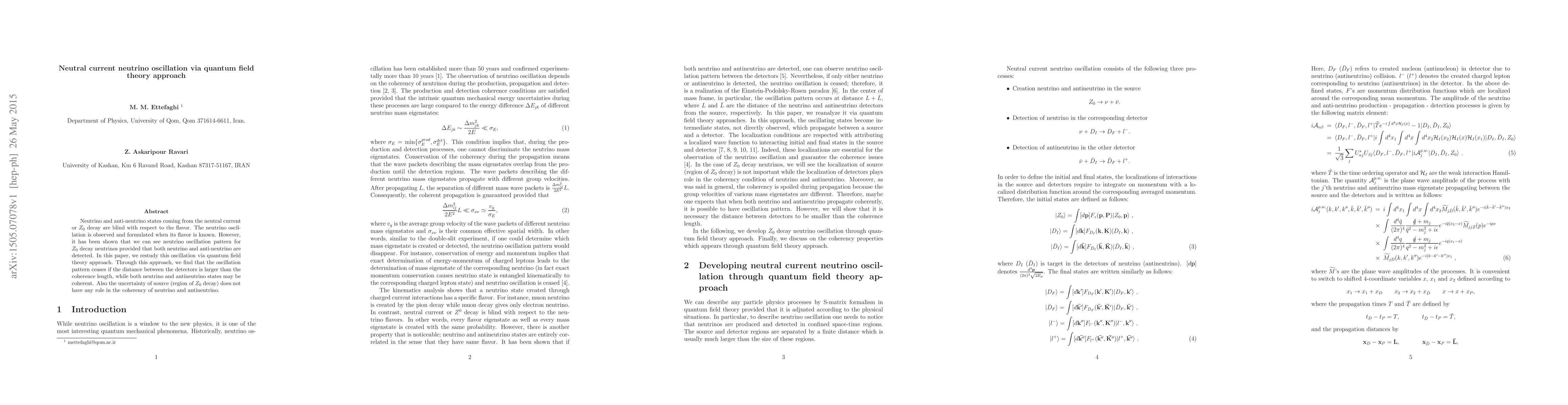 This paper explores neutral current neutrino oscillation via quantum field theory, demonstrating that oscillation patterns can be observed in $Z_0$ decay neutrinos when both neutrino and anti-neutrino are detected. The study finds that coherence and oscillation cease if the detector distance exceeds the coherence length, while the source uncertainty does not affect coherence.
