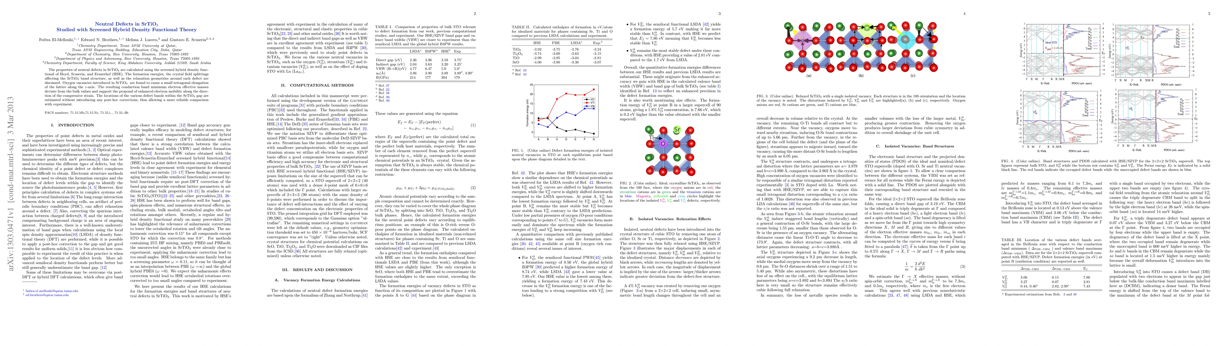 This study investigates neutral defects in SrTiO3 using screened hybrid density functional theory, finding that oxygen vacancies cause a small tetragonal lattice elongation along the z-axis, which enhances electron mobility and modifies the conduction band minimum electron effective masses. Accurate defect band positions within the SrTiO3 gap are estimated without post hoc corrections for better experimental comparison.