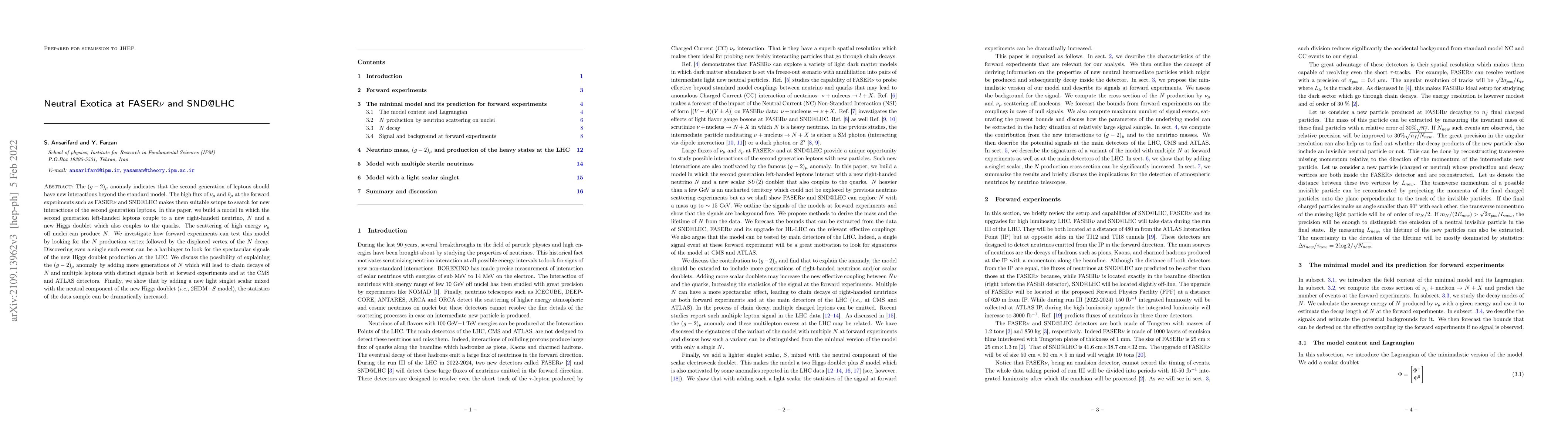 The $(g-2)_\mu$ anomaly indicates that the second generation of leptons should have new interactions beyond the standard model. The high flux of $\nu_\mu$ and $\bar{\nu}_\mu$ at the forward experiments such as FASER$\nu$ and SND@LHC makes them suitable setups to search for new interactions of the second generation leptons. In this paper, we build a model in which the second generation left-handed leptons couple to a new right-handed neutrino, $N$ and a new Higgs doublet which also couples to the quarks. The scattering of high energy $\nu_\mu$ off nuclei can produce $N$. We investigate how forward experiments can test this model by looking for the $N$ production vertex followed by the displaced vertex of the $N$ decay. Discovering even a single such event can be a harbinger to look for the spectacular signals of the new Higgs doublet production at the LHC. We discuss the possibility of explaining the $(g-2)_\mu$ anomaly by adding more generations of $N$ which will lead to chain decays of $N$ and multiple leptons with distinct signals both at forward experiments and at the CMS and ATLAS detectors. Finally, we show that by adding a new light singlet scalar mixed with the neutral component of the new Higgs doublet ({\it i.e.,} 2HDM+$S$ model), the statistics of the data sample can be dramatically increased.