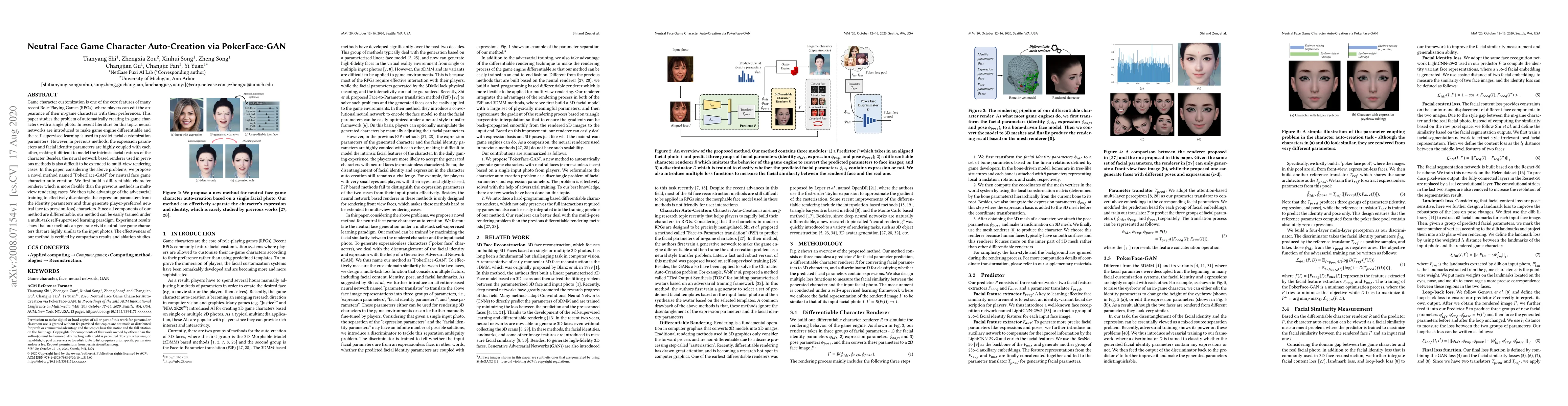 This paper proposes "PokerFace-GAN" for auto-creating neutral face game characters from a single photo using a differentiable renderer and adversarial training to disentangle expression from identity parameters. The method generates vivid, neutral characters that closely resemble input photos, validated through comparison and ablation studies.