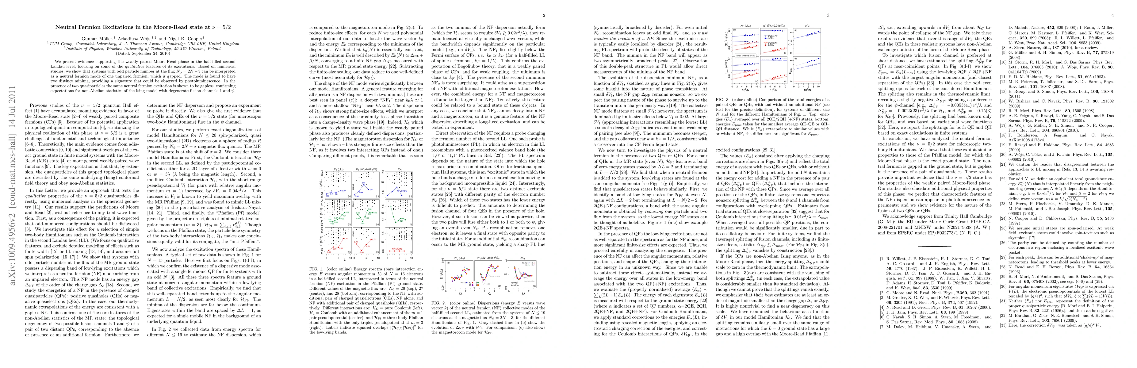 Researchers found a neutral fermion mode in a quantum Hall system with odd particle number, which is gapped but shows distinct minima that could be observed through photoluminescence. The mode behaves differently when two quasiparticles are present, confirming non-Abelian statistics.
