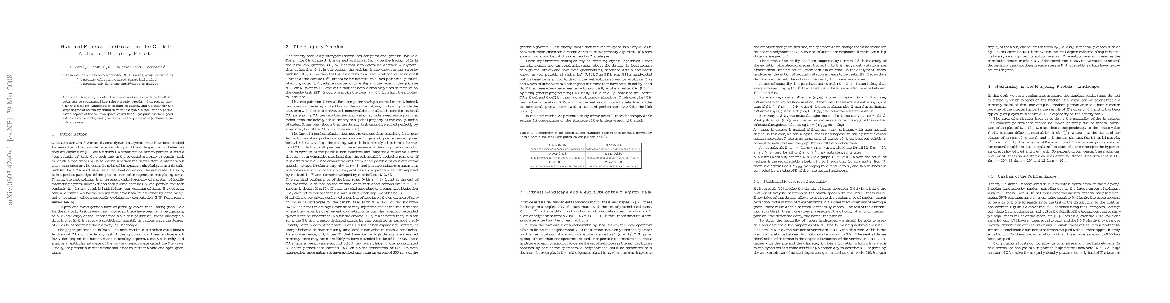 Researchers studied a difficult computational task called the majority problem in cellular automata and found that there is a concentrated region of good solutions called the 'Olympus' within the solution space. This region is difficult to search due to its neutral fitness landscape, making it hard for algorithms to find optimal solutions.
