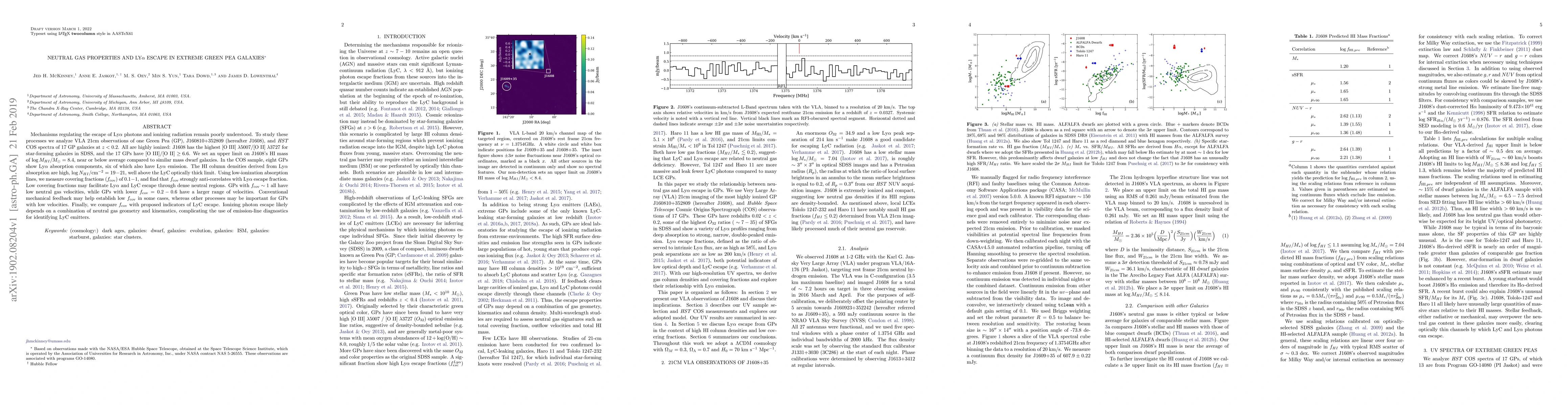 Mechanisms regulating the escape of Ly$\alpha$ photons and ionizing radiation remain poorly understood. To study these processes we analyze VLA 21cm observations of one Green Pea (GP), J160810+352809 (hereafter J1608), and HST COS spectra of 17 GP galaxies at $z<0.2$. All are highly ionized: J1608 has the highest [O III] $\lambda5007$/[O II] $\lambda3727$ for star-forming galaxies in SDSS, and the 17 GPs have [O III]/[O II] $\geq6.6$. We set an upper limit on J1608's HI mass of $\log M_{HI}/M_\odot=8.4$, near or below average compared to similar mass dwarf galaxies. In the COS sample, eight GPs show Ly$\alpha$ absorption components, six of which also have Ly$\alpha$ emission. The HI column densities derived from Ly$\alpha$ absorption are high, $\log N_{HI}/$cm$^{-2}=19-21$, well above the LyC optically thick limit. Using low-ionization absorption lines, we measure covering fractions ($f_{\mbox{cov}}$) of $0.1-1$, and find that $f_{\mbox{cov}}$ strongly anti-correlates with Ly$\alpha$ escape fraction. Low covering fractions may facilitate Ly$\alpha$ and LyC escape through dense neutral regions. GPs with $f_{\mbox{cov}}\sim1$ all have low neutral gas velocities, while GPs with lower $f_{\mbox{cov}}=0.2-0.6$ have a larger range of velocities. Conventional mechanical feedback may help establish low $f_{\mbox{cov}}$ in some cases, whereas other processes may be important for GPs with low velocities. Finally, we compare $f_{\mbox{cov}}$ with proposed indicators of LyC escape. Ionizing photon escape likely depends on a combination of neutral gas geometry and kinematics, complicating the use of emission-line diagnostics for identifying LyC emitters.