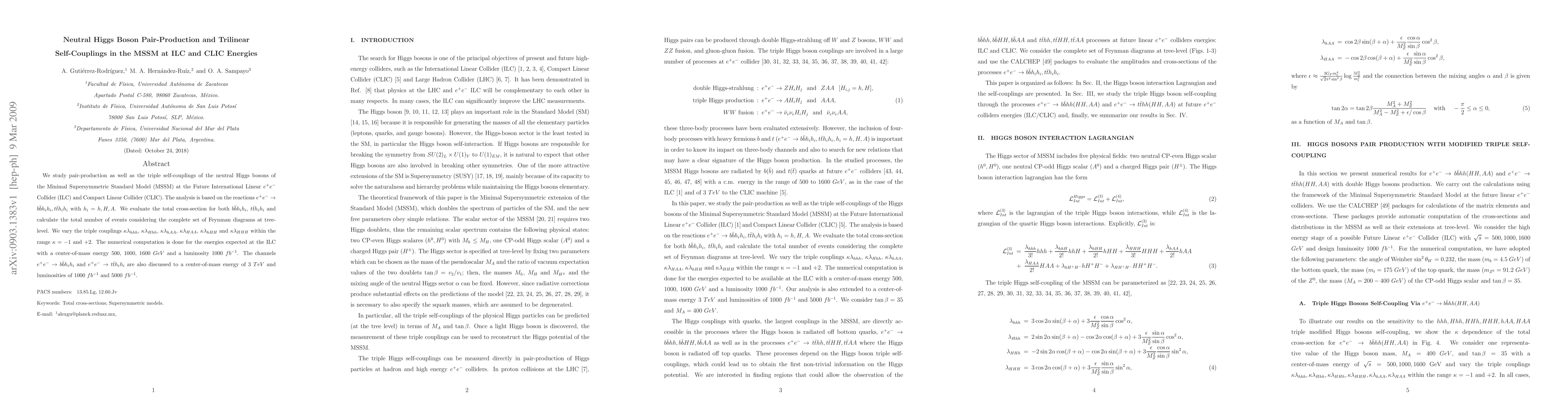 We study pair-production as well as the triple self-couplings of the neutral Higgs bosons of the Minimal Supersymmetric Standard Model (MSSM) at the Future International Linear $e^{+}e^{-}$ Collider (ILC) and Compact Linear Collider (CLIC). The analysis is based on the reactions $e^{+}e^{-}\to b \bar b h_ih_i, t \bar t h_ih_i$ with $h_i=h, H, A$. We evaluate the total cross-section for both $b\bar bh_ih_i$, $t\bar th_ih_i$ and calculate the total number of events considering the complete set of Feynman diagrams at tree-level. We vary the triple couplings $\kappa\lambda_{hhh}$, $\kappa\lambda_{Hhh}$, $\kappa\lambda_{hAA}$, $\kappa\lambda_{HAA}$, $\kappa\lambda_{hHH}$ and $\kappa\lambda_{HHH}$ within the range $\kappa=-1$ and +2. The numerical computation is done for the energies expected at the ILC with a center-of-mass energy 500, 1000, 1600 $GeV$ and a luminosity 1000 $fb^{-1}$. The channels $e^{+}e^{-}\to b \bar b h_ih_i$ and $e^{+}e^{-}\to t \bar t h_ih_i$ are also discussed to a center-of-mass energy of 3 $TeV$ and luminosities of 1000 $fb^{-1}$ and 5000 $fb^{-1}$.