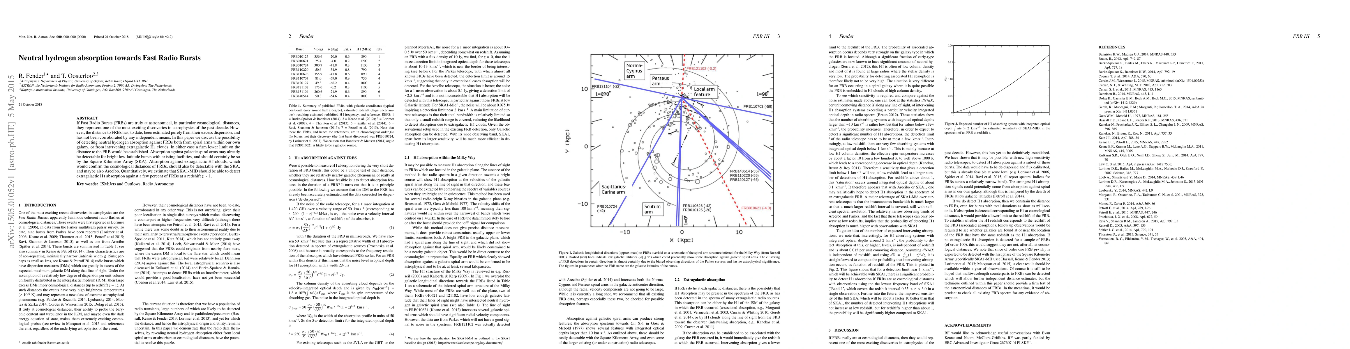 This paper explores the potential of detecting neutral hydrogen absorption against Fast Radio Bursts (FRBs) to establish a firm lower limit on their distance. It suggests that both galactic spiral arms and extragalactic HI clouds could provide such evidence, with the Square Kilometre Array (SKA) expected to significantly enhance detection capabilities.