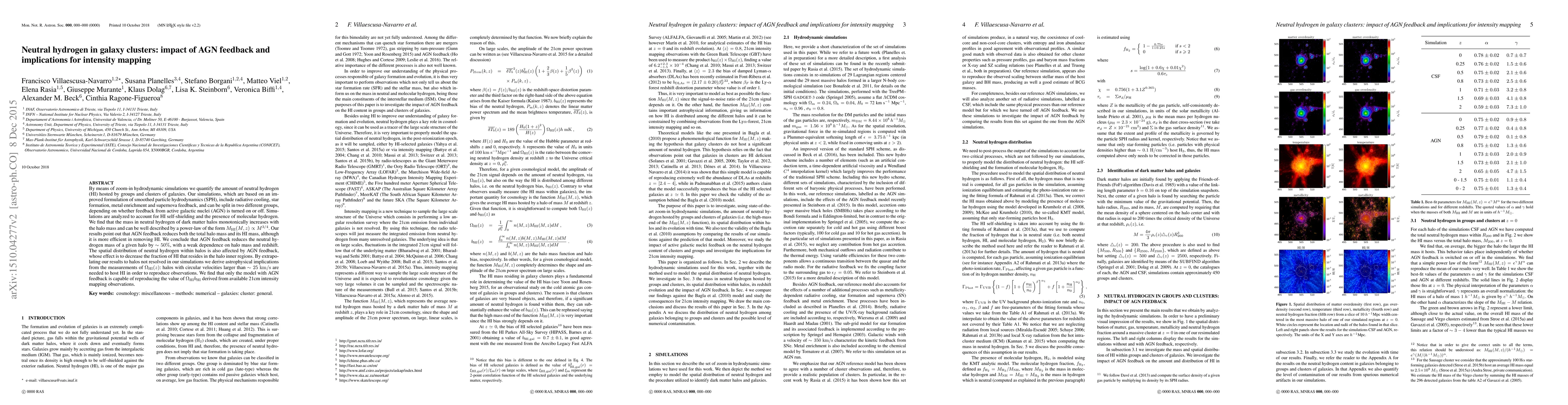 By means of zoom-in hydrodynamic simulations we quantify the amount of neutral hydrogen (HI) hosted by groups and clusters of galaxies. Our simulations, which are based on an improved formulation of smoothed particle hydrodynamics (SPH), include radiative cooling, star formation, metal enrichment and supernova feedback, and can be split in two different groups, depending on whether feedback from active galactic nuclei (AGN) is turned on or off. Simulations are analyzed to account for HI self-shielding and the presence of molecular hydrogen. We find that the mass in neutral hydrogen of dark matter halos monotonically increases with the halo mass and can be well described by a power-law of the form $M_{\rm HI}(M,z)\propto M^{3/4}$. Our results point out that AGN feedback reduces both the total halo mass and its HI mass, although it is more efficient in removing HI. We conclude that AGN feedback reduces the neutral hydrogen mass of a given halo by $\sim50\%$, with a weak dependence on halo mass and redshift. The spatial distribution of neutral hydrogen within halos is also affected by AGN feedback, whose effect is to decrease the fraction of HI that resides in the halo inner regions. By extrapolating our results to halos not resolved in our simulations we derive astrophysical implications from the measurements of $\Omega_{\rm HI}(z)$: halos with circular velocities larger than $\sim25~{\rm km/s}$ are needed to host HI in order to reproduce observations. We find that only the model with AGN feedback is capable of reproducing the value of $\Omega_{\rm HI}b_{\rm HI}$ derived from available 21cm intensity mapping observations.