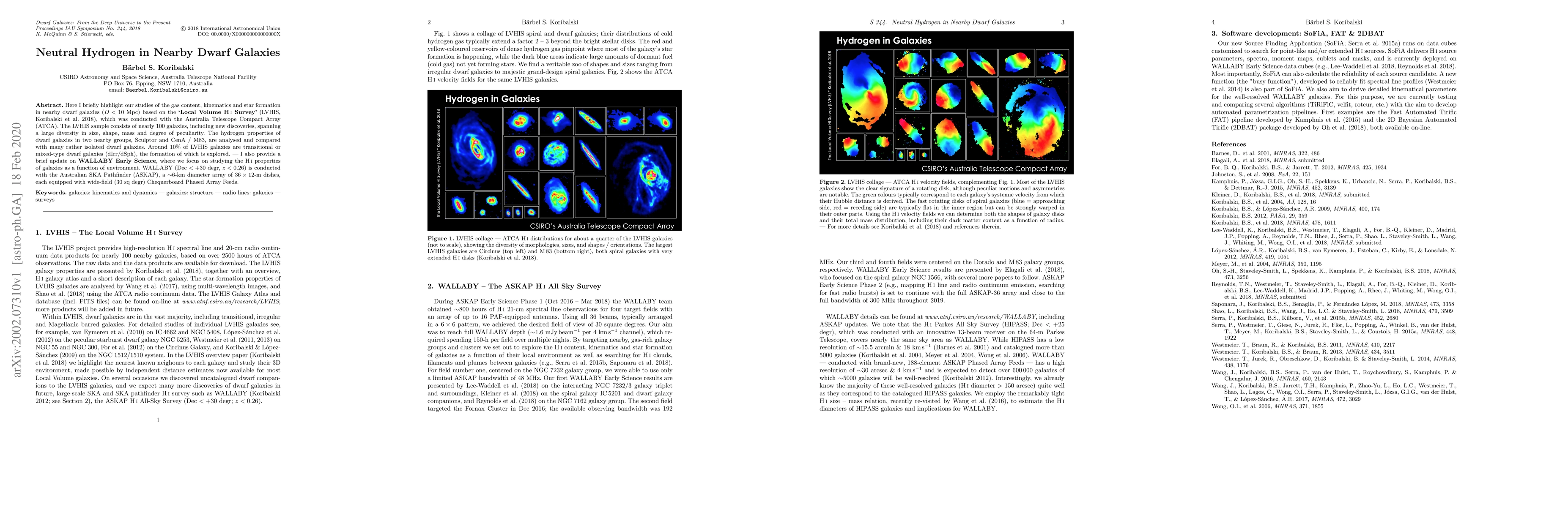 Here I briefly highlight our studies of the gas content, kinematics and star formation in nearby dwarf galaxies (D < 10 Mpc) based on the `Local Volume HI Survey' (LVHIS, Koribalski et al. 2018), which was conducted with the Australia Telescope Compact Array (ATCA). The LVHIS sample consists of nearly 100 galaxies, including new discoveries, spanning a large diversity in size, shape, mass and degree of peculiarity. The hydrogen properties of dwarf galaxies in two nearby groups, Sculptor and CenA / M83, are analysed and compared with many rather isolated dwarf galaxies. Around 10% of LVHIS galaxies are transitional or mixed-type dwarf galaxies (dIrr/dSph), the formation of which is explored. - I also provide a brief update on WALLABY Early Science, where we focus on studying the HI properties of galaxies as a function of environment. WALLABY (Dec < +30 degr, z < 0.26) is conducted with the Australian SKA Pathfinder (ASKAP), a 6-km diameter array of 36 x 12-m dishes, each equipped with wide-field (30 sq degr) Chequerboard Phased Array Feeds.