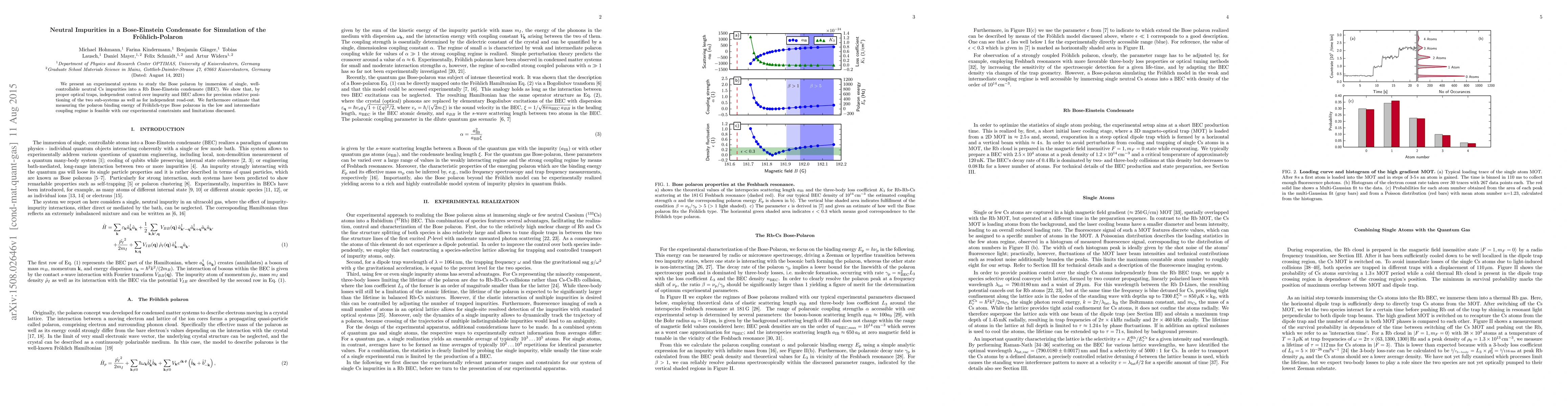 This study explores a controlled experimental system for simulating Fr\"ohlich-polarons using neutral Cs impurities immersed in a Rb Bose-Einstein condensate. The system allows precise manipulation and independent readout of the impurity and condensate, enabling feasible measurement of polaron binding energy in the low and intermediate coupling regime.