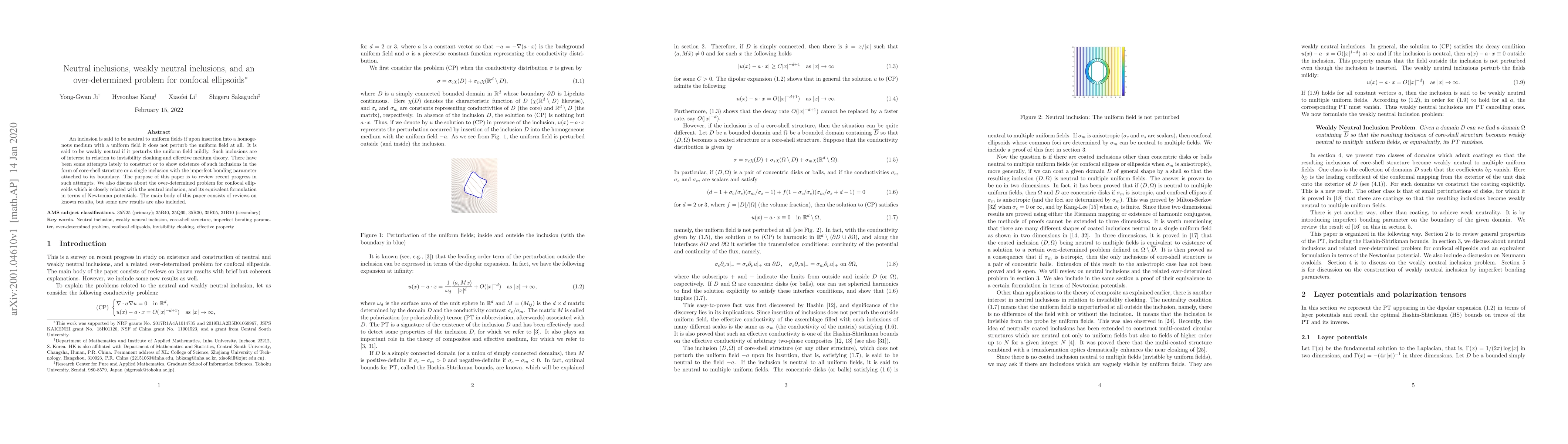 An inclusion is said to be neutral to uniform fields if upon insertion into a homogenous medium with a uniform field it does not perturb the uniform field at all. It is said to be weakly neutral if it perturbs the uniform field mildly. Such inclusions are of interest in relation to invisibility cloaking and effective medium theory. There have been some attempts lately to construct or to show existence of such inclusions in the form of core-shell structure or a single inclusion with the imperfect bonding parameter attached to its boundary. The purpose of this paper is to review recent progress in such attempts. We also discuss about the over-determined problem for confocal ellipsoids which is closely related with the neutral inclusion, and its equivalent formulation in terms of Newtonian potentials. The main body of this paper consists of reviews on known results, but some new results are also included.