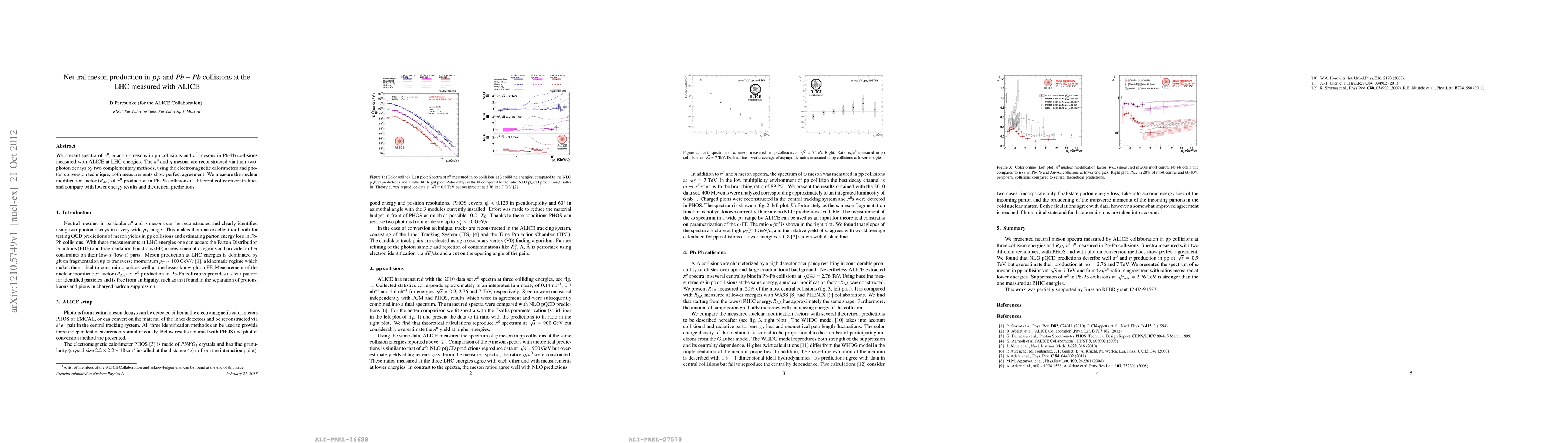 This paper reports on the production of neutral mesons ($\pi^0$, $\eta$, $\omega$) in pp collisions and $\pi^0$ mesons in Pb-Pb collisions at LHC energies using the ALICE detector. Both $\pi^0$ and $\eta$ mesons are reconstructed via their two-photon decays, showing agreement between different detection methods. The nuclear modification factor $R_{AA}$ for $\pi^0$ production in Pb-Pb collisions is measured and compared with lower energy results and theoretical predictions.
