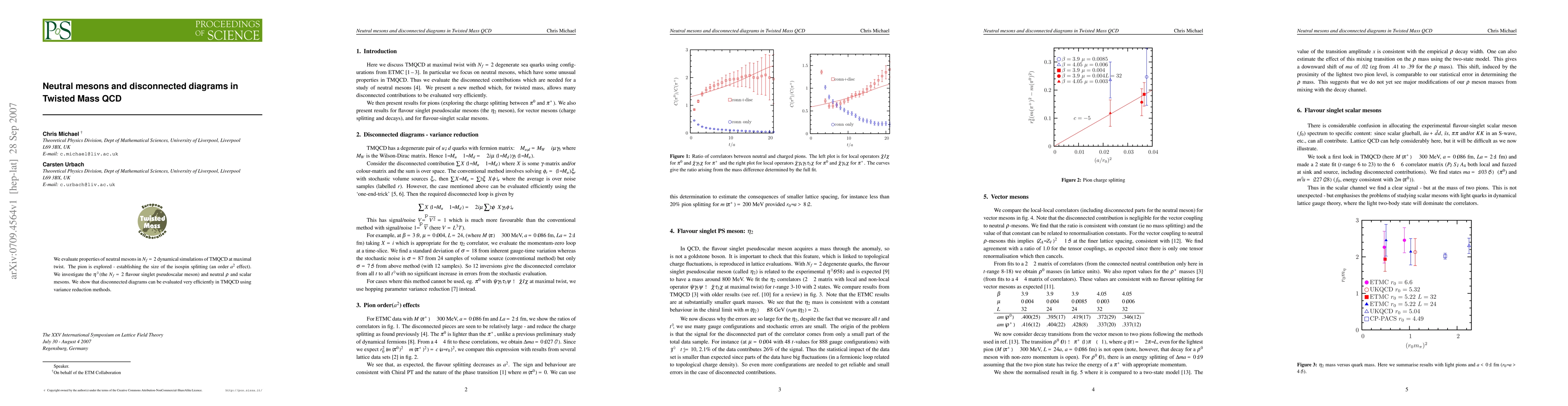 Researchers investigated neutral mesons in a specific quantum chromodynamics (QCD) model, discovering an order a^2 effect known as isospin splitting, and efficiently evaluated disconnected diagrams using variance reduction methods.