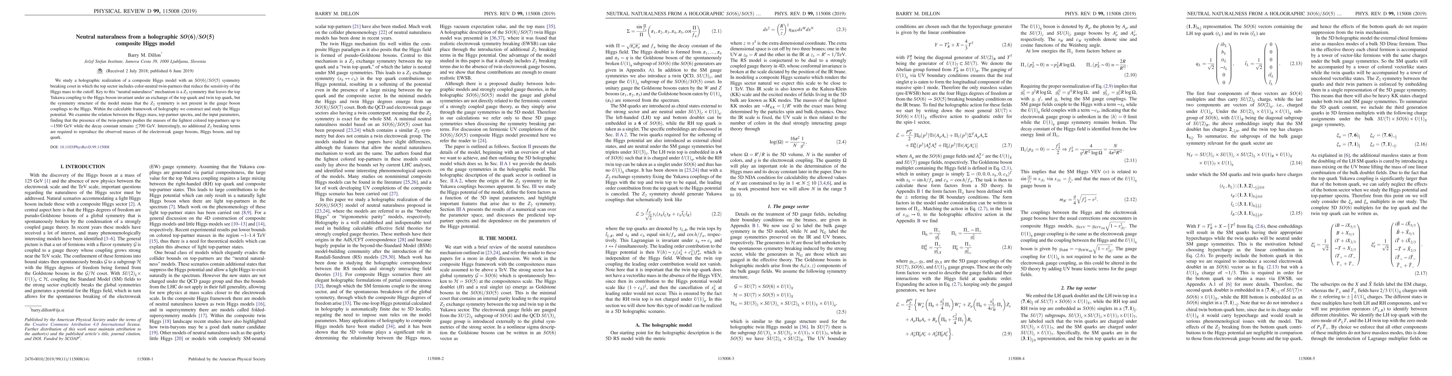 This paper explores a holographic composite Higgs model based on SO(6)/SO(5) symmetry breaking, featuring neutral twin-partners that enhance naturalness by stabilizing the Higgs mass. The model's Z2 symmetry preserves Yukawa couplings but not gauge boson couplings, leading to a calculable Higgs potential and a top-partner mass around 1500 GeV without additional Z2 breaking terms.