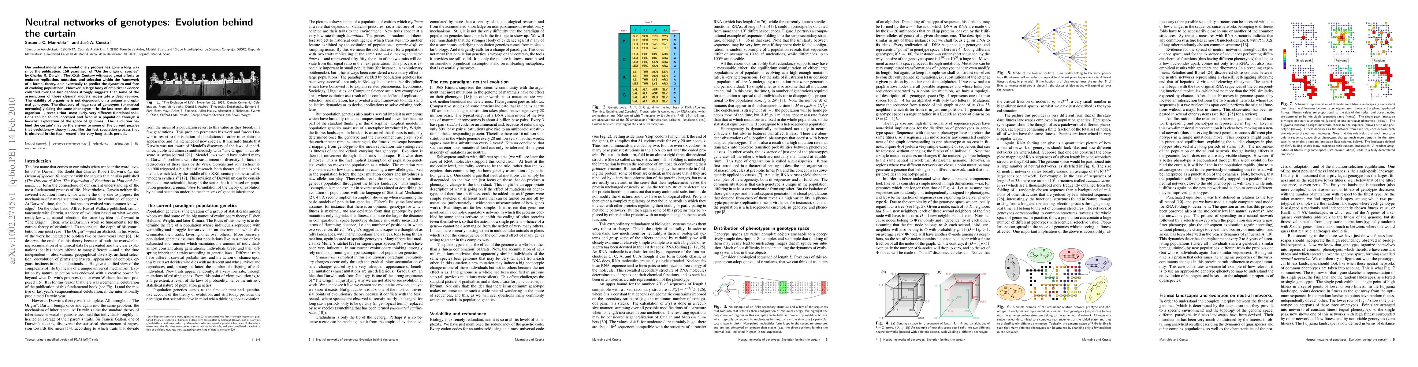 Our understanding of the evolutionary process has gone a long way since the publication, 150 years ago, of "On the origin of species" by Charles R. Darwin. The XXth Century witnessed great efforts to embrace replication, mutation, and selection within the framework of a formal theory, able eventually to predict the dynamics and fate of evolving populations. However, a large body of empirical evidence collected over the last decades strongly suggests that some of the assumptions of those classical models necessitate a deep revision. The viability of organisms is not dependent on a unique and optimal genotype. The discovery of huge sets of genotypes (or neutral networks) yielding the same phenotype --in the last term the same organism--, reveals that, most likely, very different functional solutions can be found, accessed and fixed in a population through a low-cost exploration of the space of genomes. The 'evolution behind the curtain' may be the answer to some of the current puzzles that evolutionary theory faces, like the fast speciation process that is observed in the fossil record after very long stasis periods.