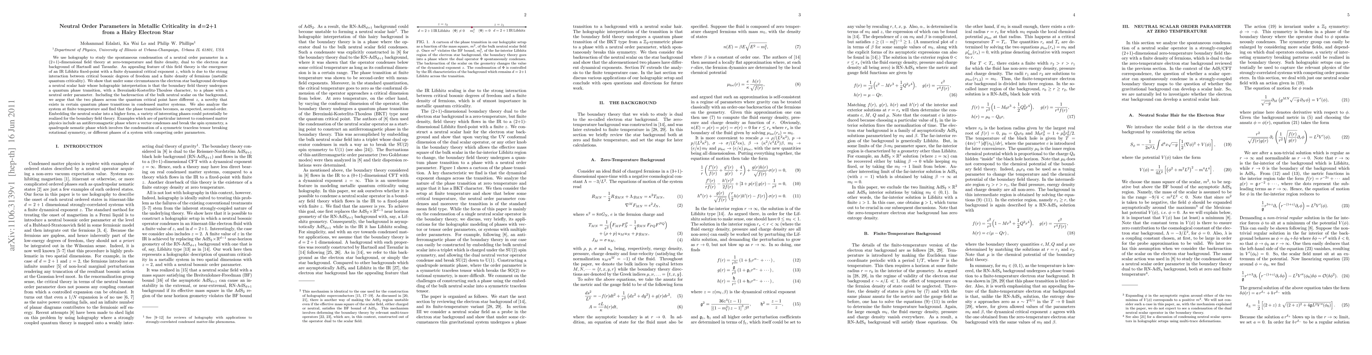 We use holography to study the spontaneous condensation of a neutral order parameter in a (2+1)-dimensional field theory at zero-temperature and finite density, dual to the electron star background of Hartnoll and Tavanfar. An appealing feature of this field theory is the emergence of an IR Lifshitz fixed-point with a finite dynamical critical exponent $z$, which is due to the strong interaction between critical bosonic degrees of freedom and a finite density of fermions (metallic quantum criticality). We show that under some circumstances the electron star background develops a neutral scalar hair whose holographic interpretation is that the boundary field theory undergoes a quantum phase transition, with a Berezinski-Kosterlitz-Thouless character, to a phase with a neutral order parameter. Including the backreaction of the bulk neutral scalar on the background, we argue that the two phases across the quantum critical point have different $z$, a novelty that exists in certain quantum phase transitions in condensed matter systems. We also analyze the system at finite temperature and find that the phase transition becomes, as expected, second-order. Embedding the neutral scalar into a higher form, a variety of interesting phases could potentially be realized for the boundary field theory. Examples which are of particular interest to condensed matter physics include an antiferromagnetic phase where a vector condenses and break the spin symmetry, a quadrupole nematic phase which involves the condensation of a symmetric traceless tensor breaking rotational symmetry, or different phases of a system with competing order parameters.