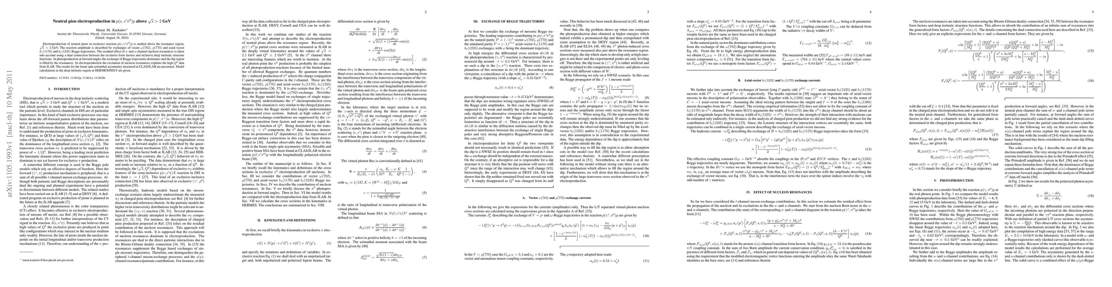 Electroproduction of neutral pions in exclusive reaction $p(e,e'\pi^0)p$ is studied above the resonance region, $\sqrt{s}>2$ GeV. The reaction amplitude is described by exchanges of vector $\omega(782)$, $\rho(770)$ and axial-vector $h_1(1170)$ and $b_1(1235)$ Regge trajectories. The residual effect of $s$- and $u$-channel nucleon resonances is taken into account using a dual connection between the exclusive form factors and inclusive deep inelastic structure functions. In photoproduction at forward angles the exchange of Regge trajectories dominates and the dip region is filled by the resonances. In electroproduction the excitation of nucleon resonances explains the high $Q^2$ data from JLAB. The results for the beam spin azimuthal asymmetry measured at CLAS/JLAB are presented. Model calculations in the deep inelastic region at HERMES/DESY are given.
