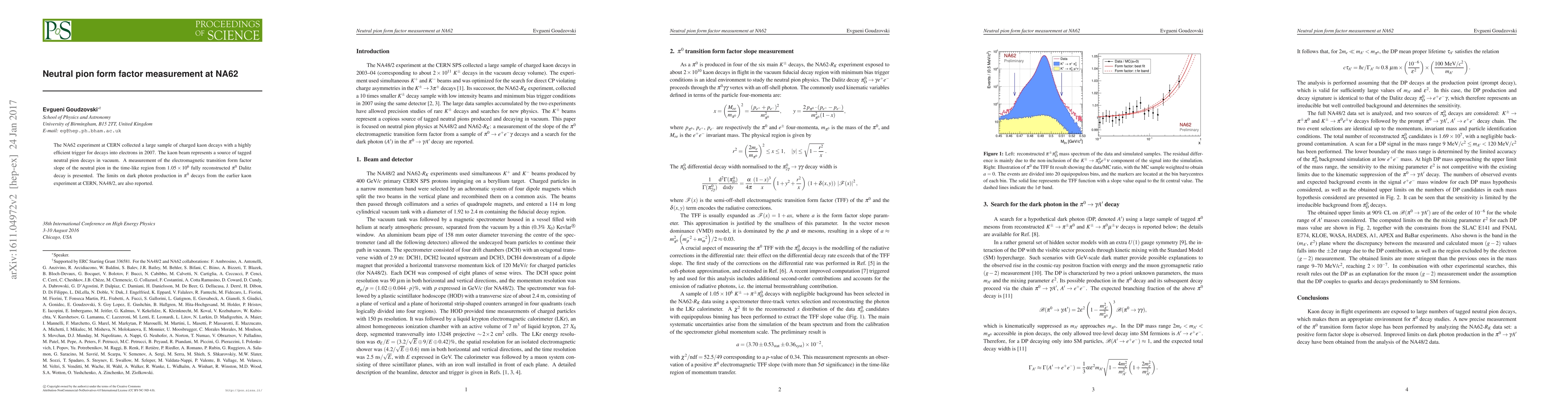The NA62 experiment at CERN collected a large sample of charged kaon decays with a highly efficient trigger for decays into electrons in 2007. The kaon beam represents a source of tagged neutral pion decays in vacuum. A measurement of the electromagnetic transition form factor slope of the neutral pion in the time-like region from $1.05\times10^6$ fully reconstructed $\pi^0$ Dalitz decay is presented. The limits on dark photon production in $\pi^0$ decays from the earlier kaon experiment at CERN, NA48/2, are also reported.