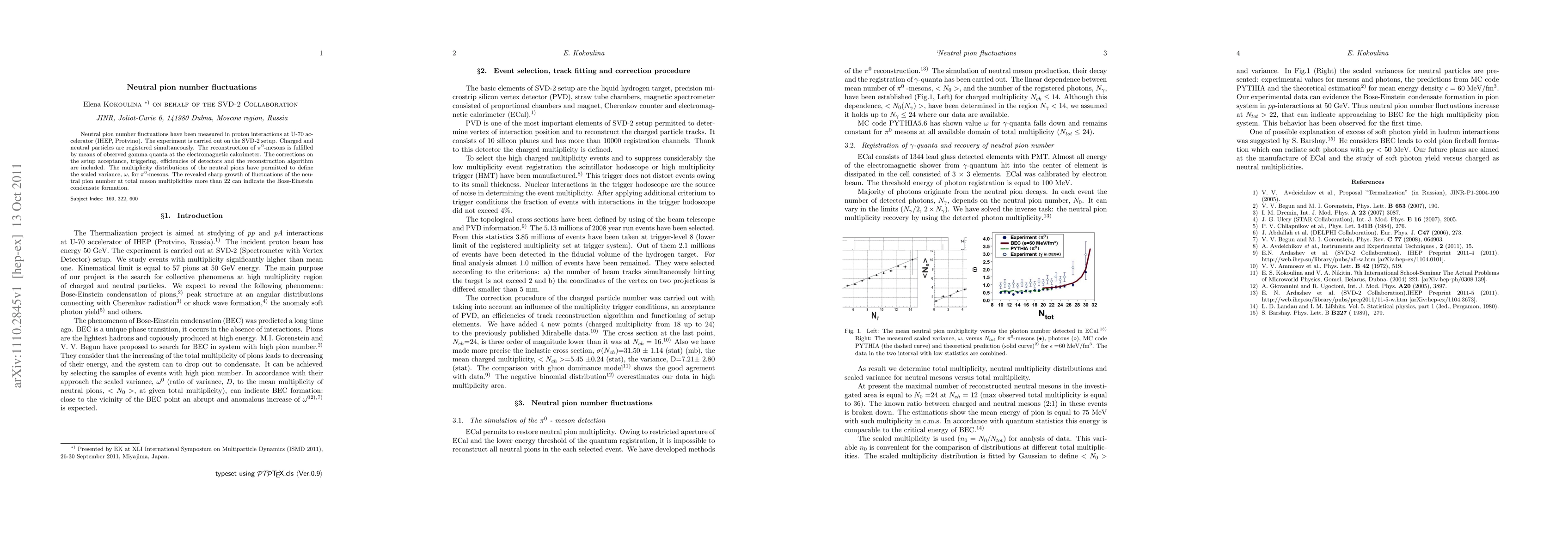 This paper reports on neutral pion number fluctuations measured in proton interactions at the U-70 accelerator using the SVD-2 setup. The experiment reveals a sharp increase in fluctuations for total meson multiplicities exceeding 22, suggesting the possible formation of a Bose-Einstein condensate.