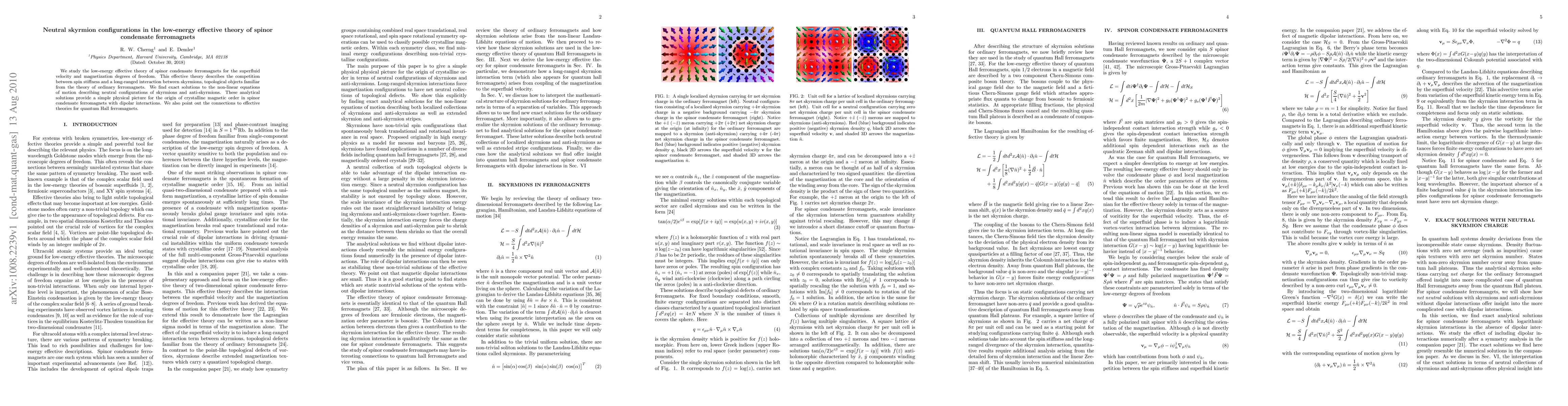 We study the low-energy effective theory of spinor condensate ferromagnets for the superfluid velocity and magnetization degrees of freedom. This effective theory describes the competition between spin stiffness and a long-ranged interaction between skyrmions, topological objects familiar from the theory of ordinary ferromagnets. We find exact solutions to the non-linear equations of motion describing neutral configurations of skyrmions and anti-skyrmions. These analytical solutions provide a simple physical picture for the origin of crystalline magnetic order in spinor condensate ferromagnets with dipolar interactions. We also point out the connections to effective theories for quantum Hall ferromagnets.