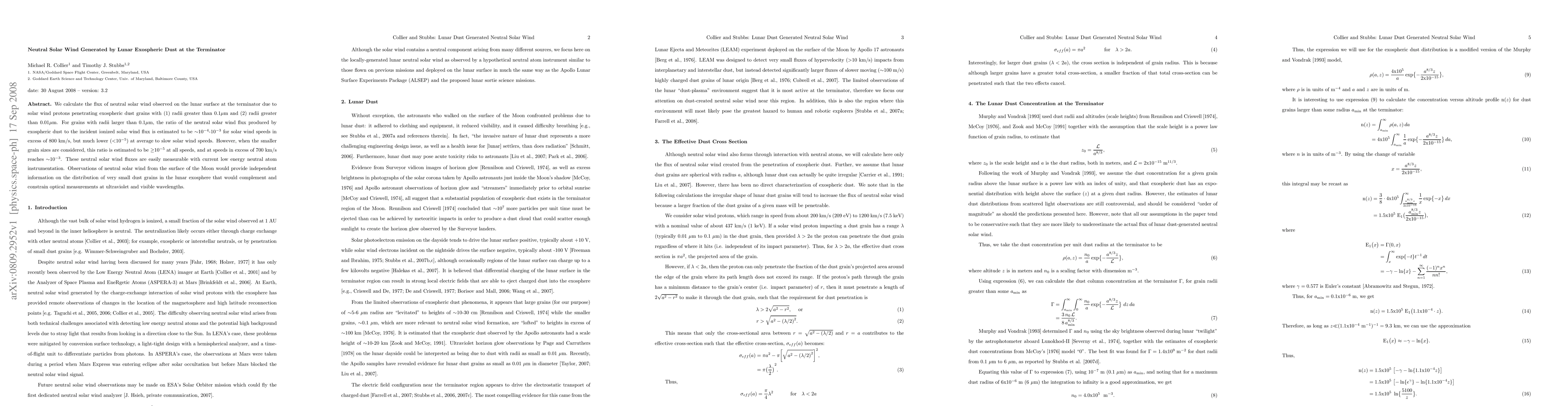 This paper estimates the flux of neutral solar wind generated by lunar exospheric dust at the terminator, finding that larger grains (radius > 0.1 microns) produce neutral fluxes comparable to incident solar wind at high speeds, while smaller grains (radius > 0.01 microns) generate measurable neutral fluxes across all speeds.