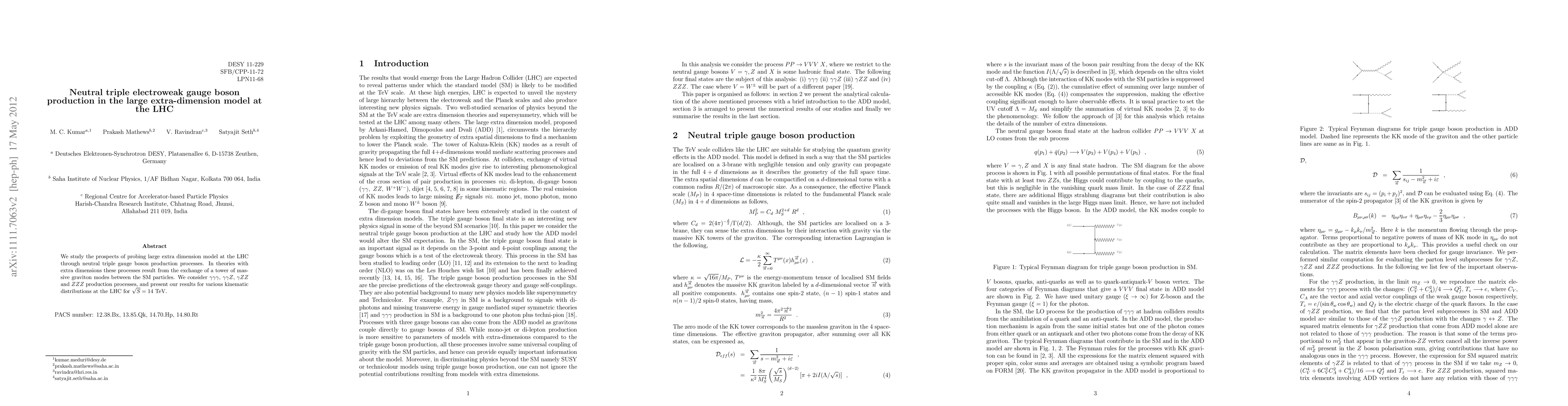 This paper investigates the potential of the LHC to probe large extra dimension models via neutral triple gauge boson production, focusing on processes like \gamma\gamma\gamma, \gamma\gamma Z, \gamma Z Z, and ZZZ. The study presents kinematic distributions for these processes at a 14 TeV collision energy.