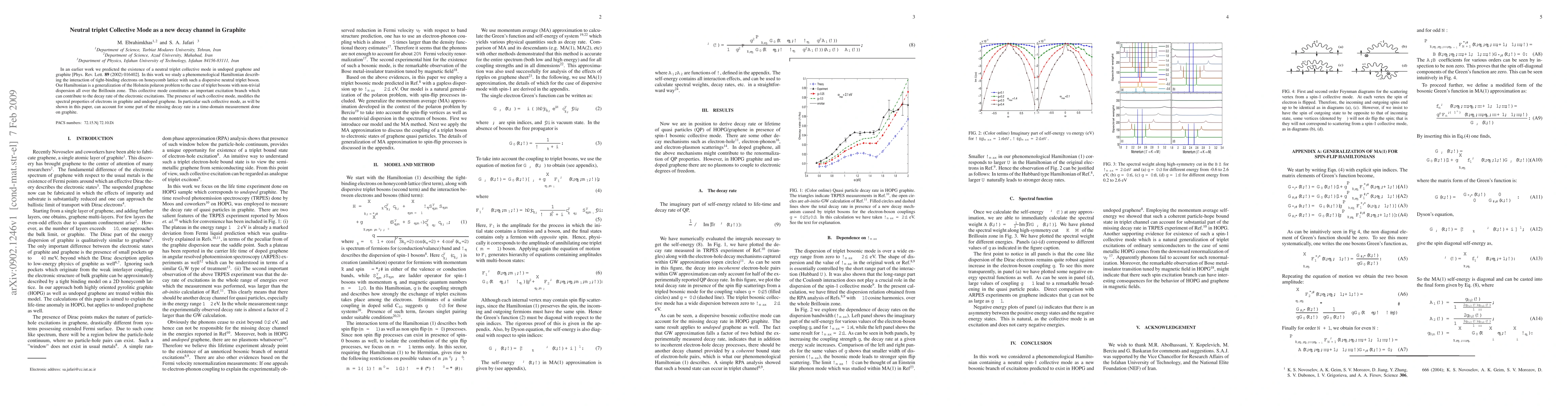 This paper investigates the neutral triplet collective mode in undoped graphene and graphite, demonstrating its role as a new decay channel for electronic excitations. The study employs a generalized phenomenological Hamiltonian to describe the interaction between electrons and this dispersive neutral triplet boson, revealing its contribution to the missing decay rate observed in graphite.