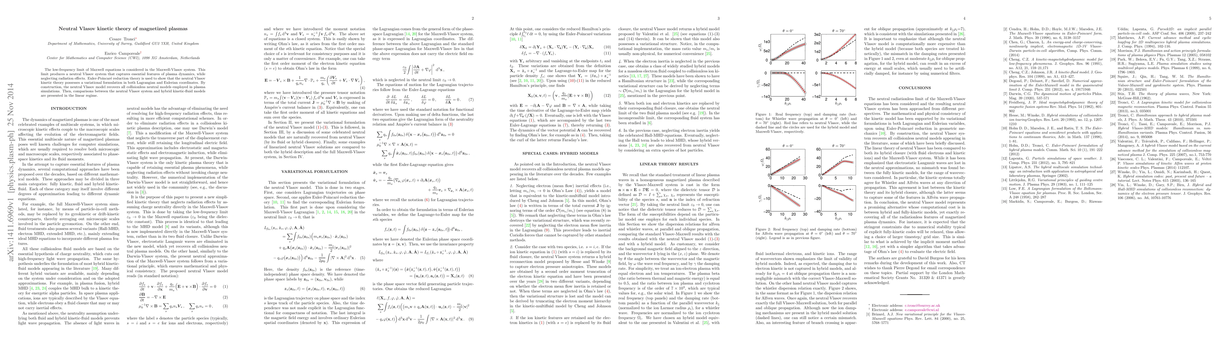 The low-frequency limit of Maxwell equations is considered in the Maxwell-Vlasov system. This limit produces a neutral Vlasov system that captures essential features of plasma dynamics, while neglecting radiation effects. Euler-Poincar\'e reduction theory is used to show that the neutral Vlasov kinetic theory possesses a variational formulation in both Lagrangian and Eulerian coordinates. By construction, the model recovers all collisionless neutral models employed in plasma simulations. Then, comparisons between the neutral Vlasov system and hybrid kinetic-fluid models are presented in the linear regime.