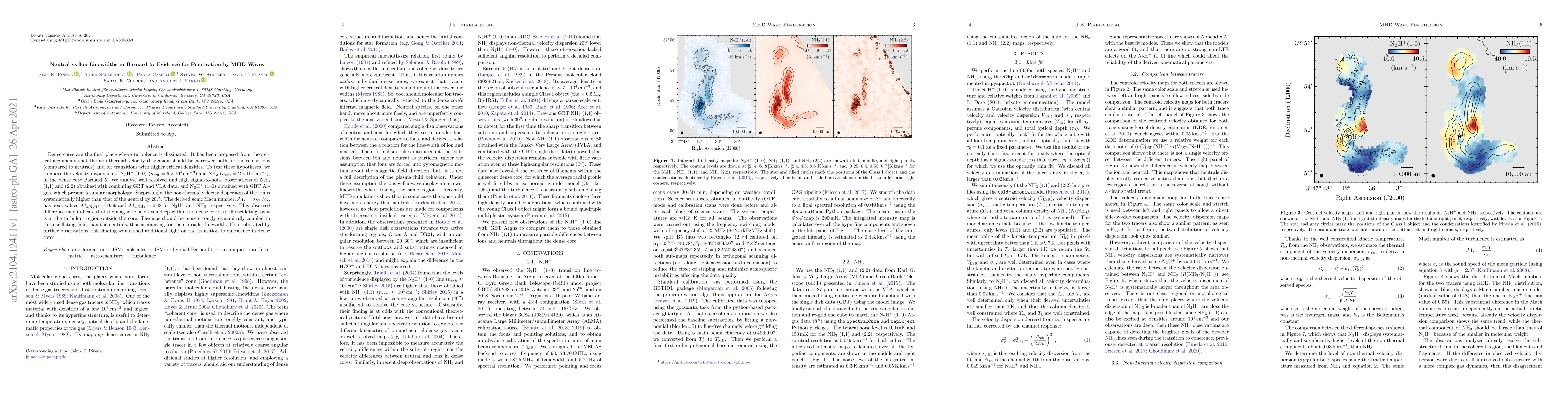 Dense cores are the final place where turbulence is dissipated. It has been proposed from theoretical arguments that the non-thermal velocity dispersion should be narrower both for molecular ions (compared to neutrals) and for transitions with higher critical densities. To test these hypotheses, we compare the velocity dispersion of N$_2$H$^+$ (1--0) (n$_{\rm crit}$ = $6\times10^4$ cm$^{-3}) and NH$_3$ (n$_{\rm crit}=2\times10^3$ cm$^{-3}), in the dense core Barnard 5. We analyse well resolved and high signal-to-noise observations of NH$_3$ (1,1) and (2,2) obtained with combining GBT and VLA data, and N$_2$H$^+$ (1--0) obtained with GBT Argus, which present a similar morphology. % Surprisingly, the non-thermal velocity dispersion of the ion is systematically higher than that of the neutral by 20\%. The derived sonic Mach number, $\mathcal{M}_s = \sigma_{\rm NT}/c_s$, has peak values $\mathcal{M}_{s, {\rm N_2H^+}} = 0.59$ and $\mathcal{M}_{s, {\rm NH}_3} = 0.48$ for N$_2$H$^+$ and NH$_3$, respectively. % This observed difference may indicate that the magnetic field even deep within the dense core is still oscillating, as it is in the turbulent region outside the core. The ions should be more strongly dynamically coupled to this oscillating field than the neutrals, thus accounting for their broader linewidth. If corroborated by further observations, this finding would shed additional light on the transition to quiescence in dense cores.