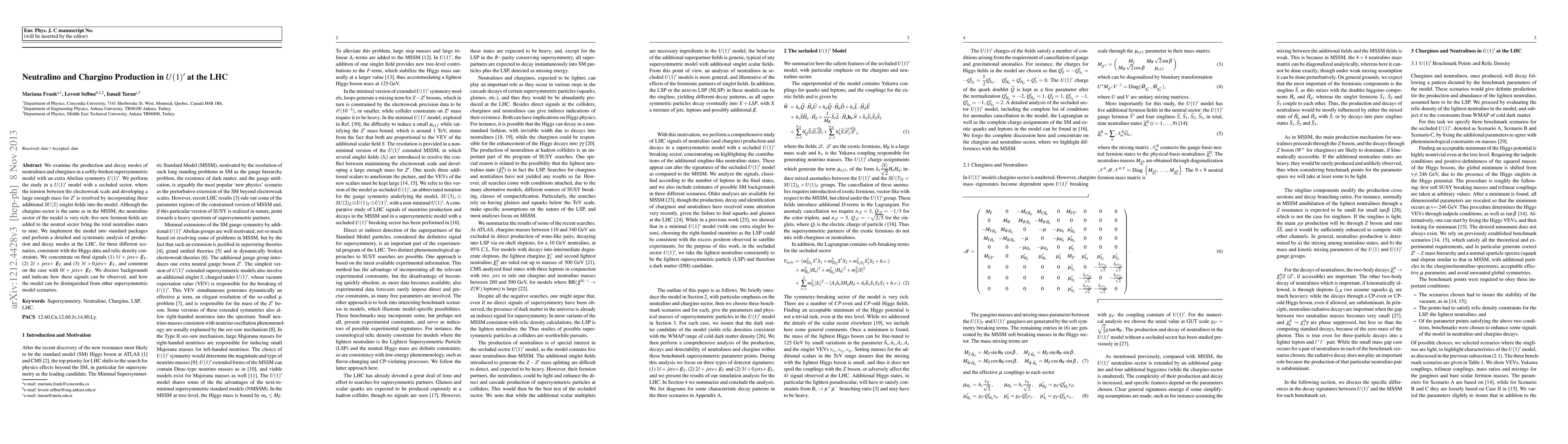 We examine the production and the decay modes of neutralinos and charginos in a softly-broken supersymmetric model with an extra Abelian symmetry U(1)'. We perform the study in a U(1)' model with a secluded sector, where the tension between the electroweak scale and developing a large enough mass for Z' is resolved by incorporating three additional SU(2) singlet fields into the model. Although the chargino sector is the same as in the MSSM, the neutralino sector of the model is very rich: five new fermion fields are added to the neutral sector bring the total neutralino states to nine. We implement the model into standard packages and perform a detailed and systematic analysis of production and decay modes at the LHC, for three different scenarios, and concentrating on final signals (1) 1 lepton+jets +MET, (2) 2 leptons+jets +MET and (3) 3 lepton+0jets +MET, and comment on the case with 0 lepton+jets +MET. We discuss backgrounds and indicate how these signals can be observed, and how the model can be distinguished from other supersymmetric model scenarios.