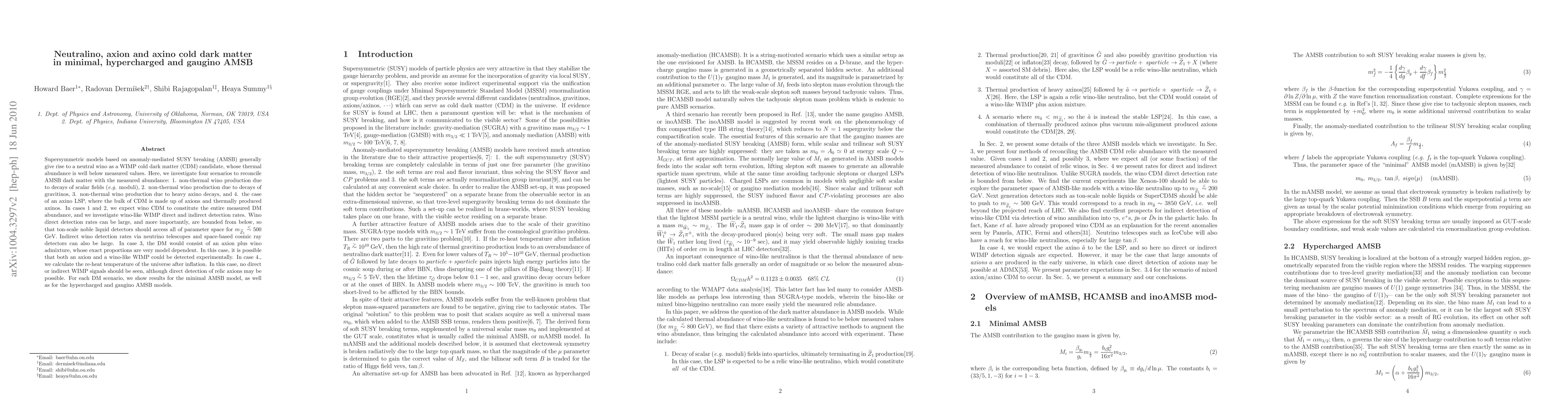 This paper explores four scenarios to reconcile anomaly-mediated SUSY breaking (AMSB) dark matter with measured cosmic abundance, including non-thermal wino production via scalar and gravitino decays, heavy axino decays, and an axino LSP scenario. It finds that wino direct detection rates can be substantial and bounded, making them accessible to ton-scale detectors for certain wino masses. In some cases, both axions and wino-like WIMPs could be experimentally detectable, while in others, only relic axions might be observed.