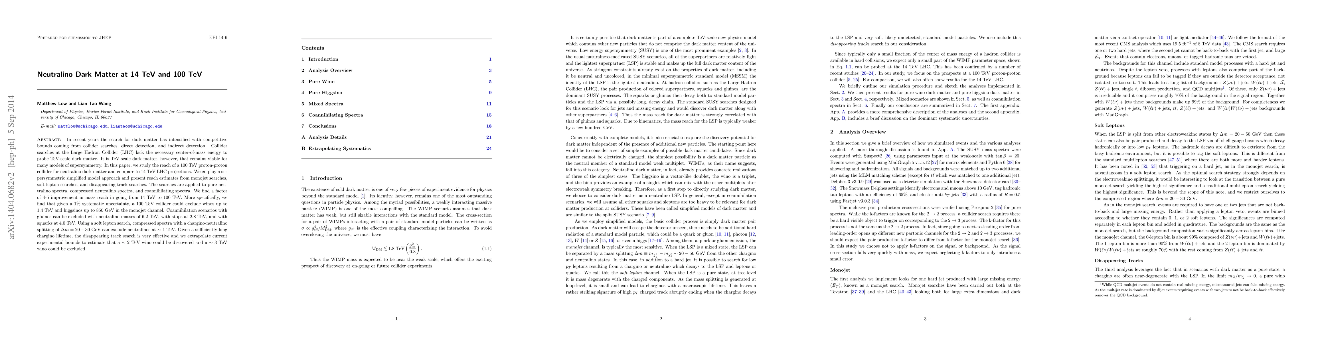 The paper presents detailed reach estimates for neutralino dark matter at 100 TeV using various search channels, providing a comprehensive comparison with 14 TeV LHC projections.