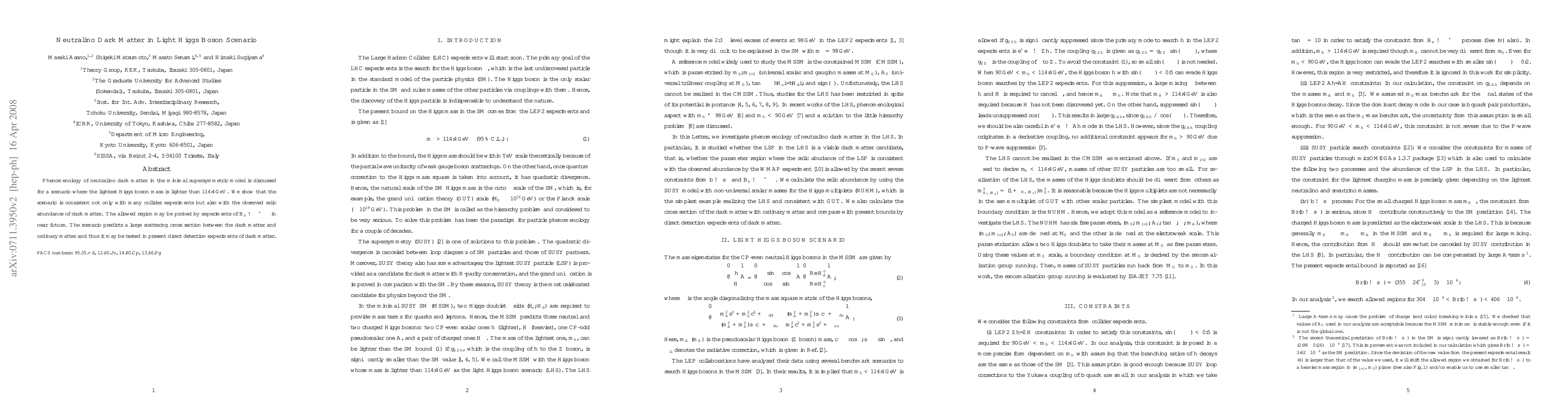 This paper explores neutralino dark matter in the minimal supersymmetric model with a light Higgs boson (mass <114.4 GeV), demonstrating consistency with collider experiments and the observed dark matter relic abundance. Future Bs to mu^+ mu^- experiments and current direct detection experiments may test this scenario.