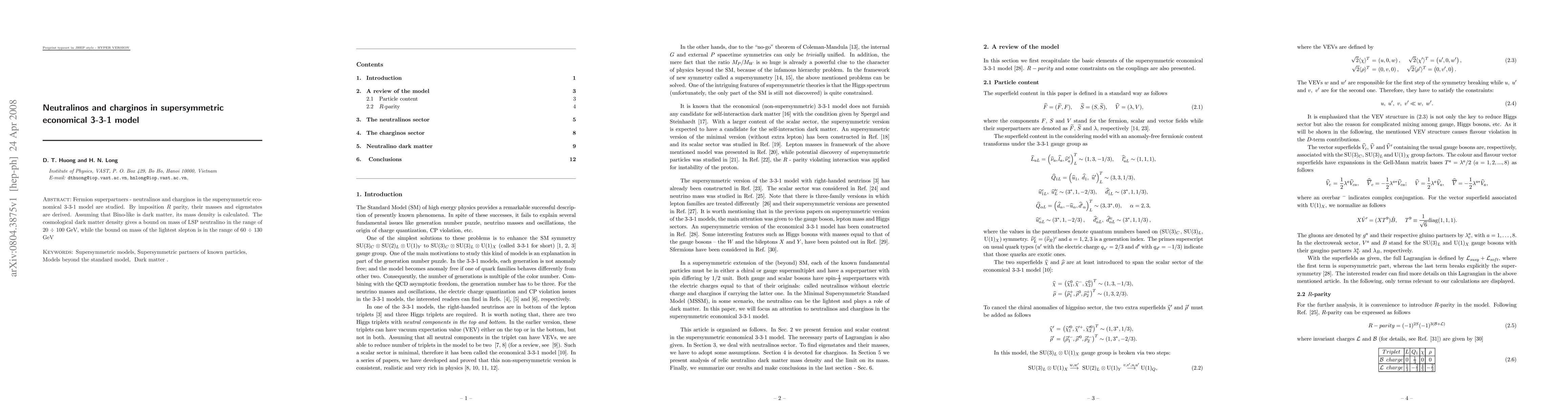 This paper investigates the fermion superpartners, neutralinos and charginos, in a supersymmetric economical 3-3-1 model, deriving their masses and eigenstates under R parity. The study finds that the Bino-like neutralino, assumed to be dark matter, has a mass density constrained by cosmological observations, placing the lightest supersymmetric particle (LSP) neutralino's mass in the range of 20-100 GeV.